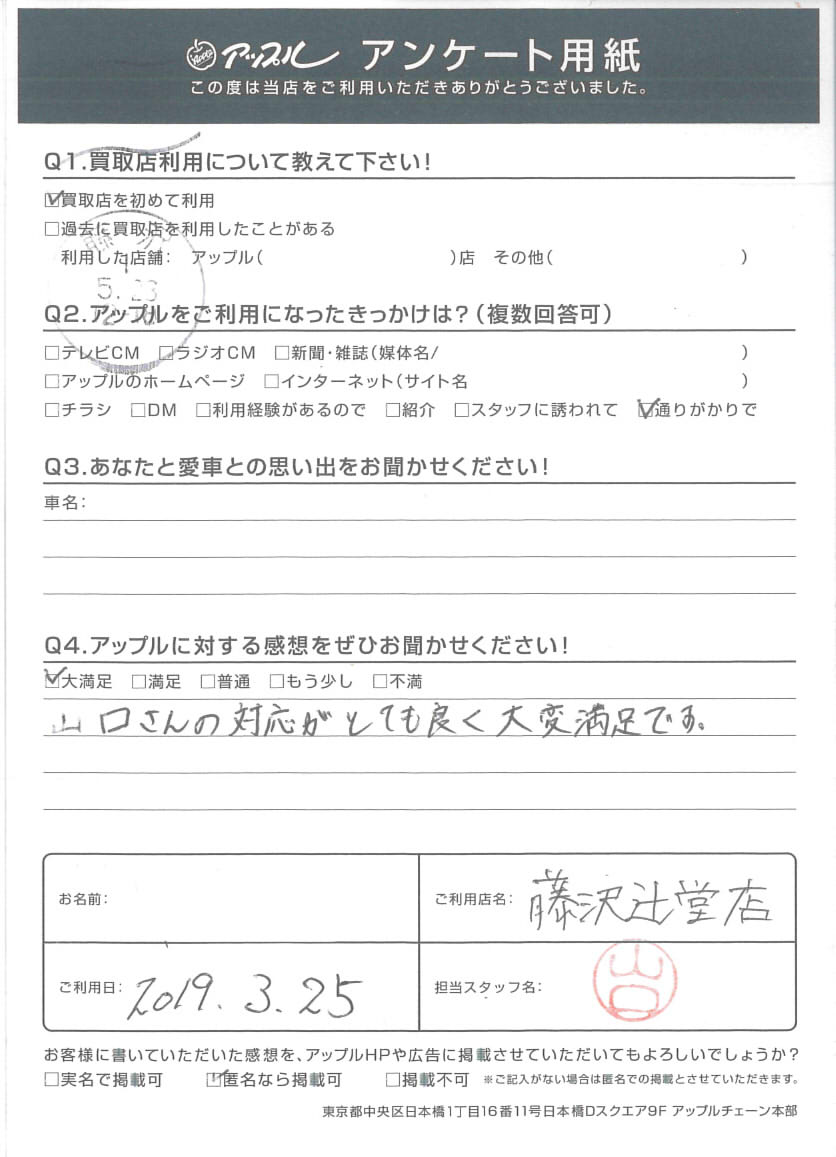 お車のご相談・ 査定だけでもOK! カンタン 入力 30秒 アップルがブランド買取始めました! お電話でも受付中! 受付時間10:00 ~ 18:30 0120-974-899 お車のご相談・ 査定だけでもOK! カンタン 入力 30秒 アップルがブランド買取始めました! お電話でも受付中! 受付時間10:00 ~ 18:30 0120-974-899 アップルがブランド買取始めました! お電話でも受付中! 受付時間10:00 ~ 18:30 0120-974-899 店舗情報 在庫車 スタッフ紹介 ブログ お客様の声 キャンペーン お得 無料査定 click お客様の声 ご記入日: 2019/11/28 N様 Q.アップルに対する感想をぜひお聞かせください!A.山口さんの対応がとても良く大変満足です。担当:山口 前へ 次へ お客様の声一覧を見る