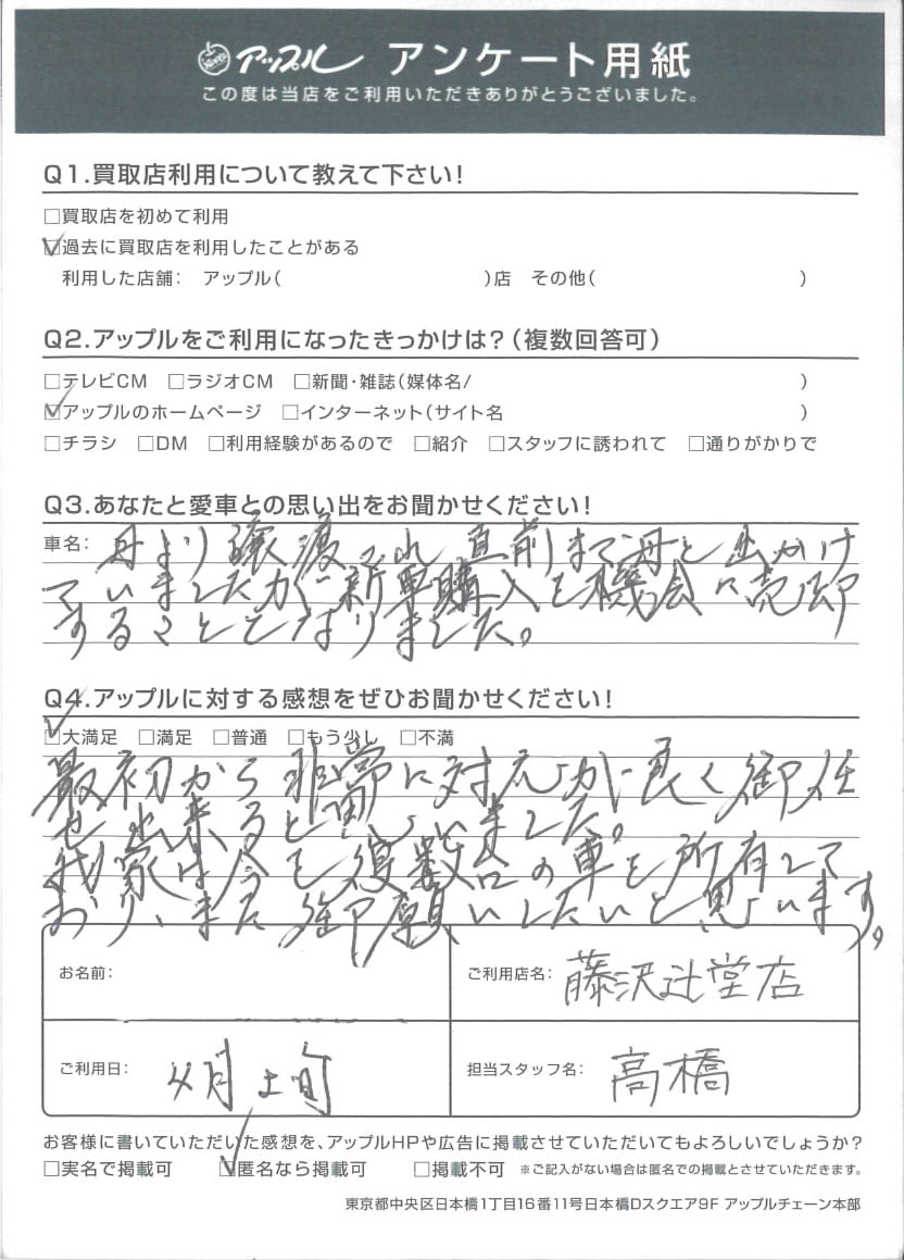 我家は今も複数台の車を所有しており、またお願いしたいと思います。