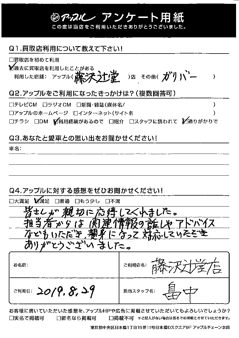 お車のご相談・ 査定だけでもOK! カンタン 入力 30秒 アップルがブランド買取始めました! お電話でも受付中! 受付時間10:00 ~ 18:30 0120-974-899 お車のご相談・ 査定だけでもOK! カンタン 入力 30秒 アップルがブランド買取始めました! お電話でも受付中! 受付時間10:00 ~ 18:30 0120-974-899 アップルがブランド買取始めました! お電話でも受付中! 受付時間10:00 ~ 18:30 0120-974-899 店舗情報 在庫車 スタッフ紹介 ブログ お客様の声 キャンペーン お得 無料査定 click お客様の声 ご記入日: 2019/08/29 M様 Q.アップルに対する感想をぜひお聞かせください!A.皆さんが親切に応対してくれました。 担当者からは関連情報の話やアドバイスなども いただき、親身になって対応していただき ありがとうございました。担当:畠中 前へ 次へ お客様の声一覧を見る