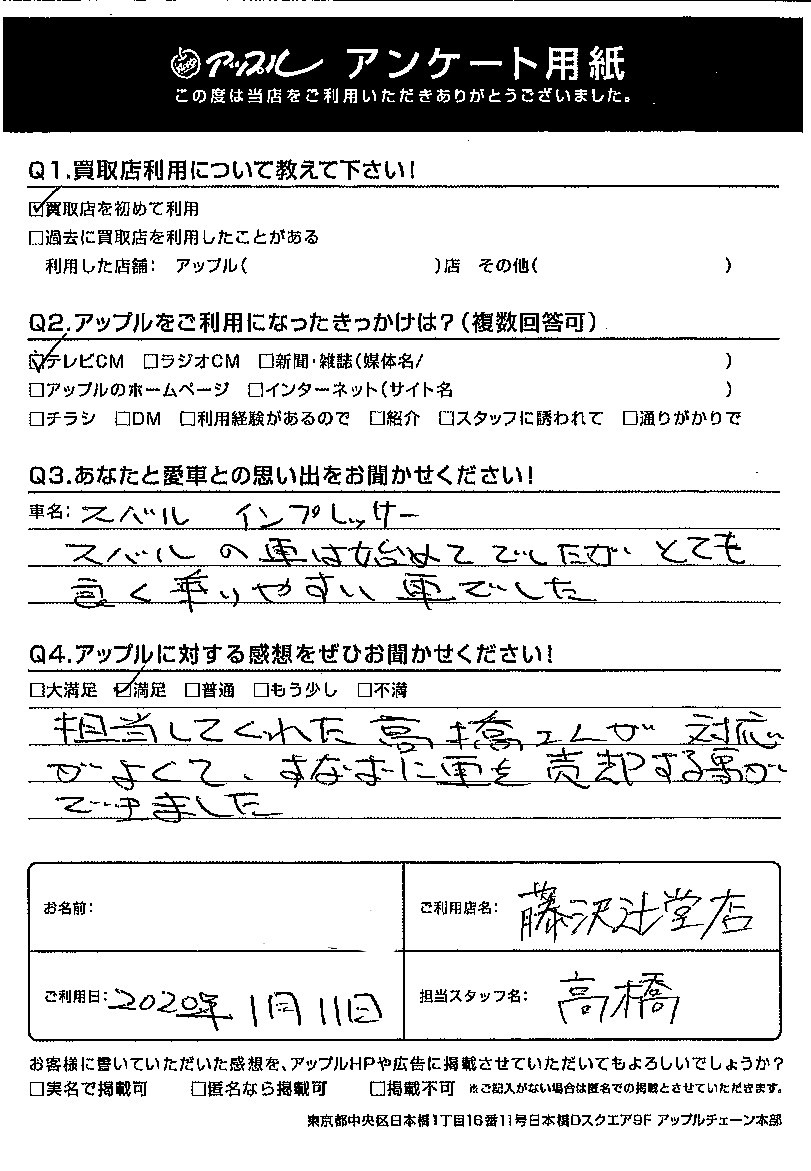 お車のご相談・ 査定だけでもOK! カンタン 入力 30秒 アップルがブランド買取始めました! お電話でも受付中! 受付時間10:00 ~ 18:30 0120-974-899 お車のご相談・ 査定だけでもOK! カンタン 入力 30秒 アップルがブランド買取始めました! お電話でも受付中! 受付時間10:00 ~ 18:30 0120-974-899 アップルがブランド買取始めました! お電話でも受付中! 受付時間10:00 ~ 18:30 0120-974-899 店舗情報 在庫車 スタッフ紹介 ブログ お客様の声 キャンペーン お得 無料査定 click お客様の声 ご記入日: 2020/01/11 O様 車名:スバル Q.あなたと愛車との思い出をお聞かせください!A.スバルの車は初めてでしたがとても良く乗りやすい車でしたQ.アップルに対する感想をぜひお聞かせください!A.担当してくれた高橋さんが対応がよくて すなおに車を売却する事ができました担当:高橋 前へ 次へ お客様の声一覧を見る