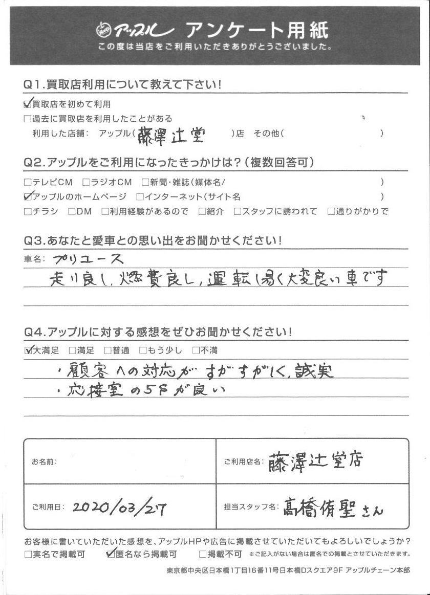 お車のご相談・ 査定だけでもOK! カンタン 入力 30秒 アップルがブランド買取始めました! お電話でも受付中! 受付時間10:00 ~ 18:30 0120-974-899 お車のご相談・ 査定だけでもOK! カンタン 入力 30秒 アップルがブランド買取始めました! お電話でも受付中! 受付時間10:00 ~ 18:30 0120-974-899 アップルがブランド買取始めました! お電話でも受付中! 受付時間10:00 ~ 18:30 0120-974-899 店舗情報 在庫車 スタッフ紹介 ブログ お客様の声 キャンペーン お得 無料査定 click お客様の声 ご記入日: 2020/02/22 匿名希望様 車名:スズキ アルトラパン ラパン(アルト) Q.あなたと愛車との思い出をお聞かせください!A.初めて子どもが産まれて、2人目の出産時も共にしましたQ.アップルに対する感想をぜひお聞かせください!A.とても親身になって対応していただき安心してお任せできました担当:畠中 前へ 次へ お客様の声一覧を見る