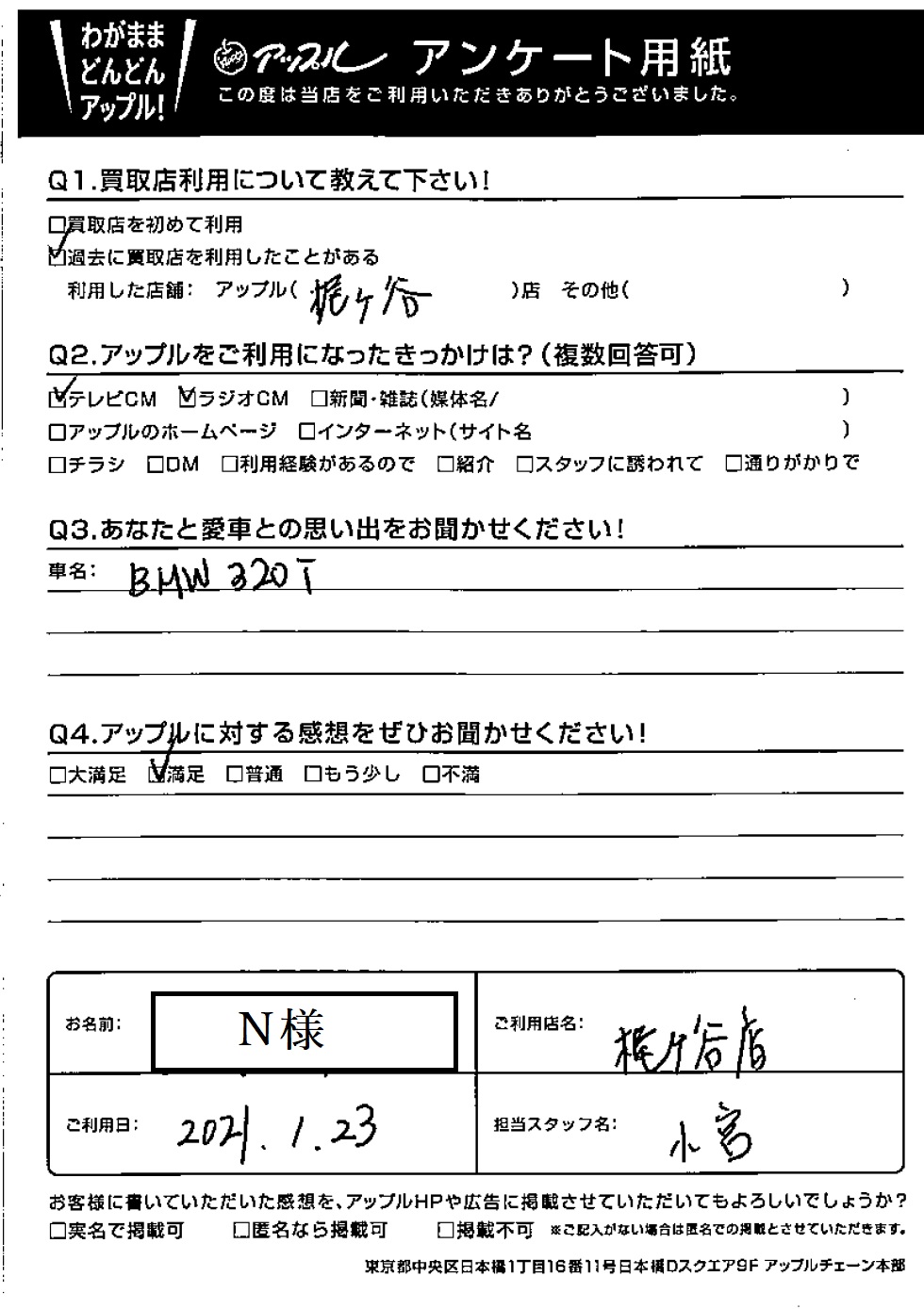 お車のご相談・ 査定だけでもOK! カンタン 入力 30秒 アップルがブランド買取始めました! お電話でも受付中! 受付時間10:00~19:00 0120-024-779 お車のご相談・ 査定だけでもOK! カンタン 入力 30秒 アップルがブランド買取始めました! お電話でも受付中! 受付時間10:00~19:00 0120-024-779 アップルがブランド買取始めました! お電話でも受付中! 受付時間10:00~19:00 0120-024-779 店舗情報 在庫車 スタッフ紹介 ブログ お客様の声 キャンペーン お得 無料査定 click お客様の声 ご記入日: -/-/- N様 車名:BMW 3シリーズセダン Q アップルに対する感想をぜひお聞かせください感想:満足 前へ 次へ お客様の声一覧を見る