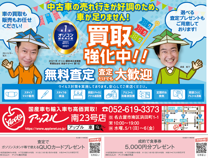 お車のご相談・ 査定だけでもOK! カンタン 入力 30秒 アップルがブランド買取始めました! お電話でも受付中! 受付時間10:00~19:00 052-619-3373 お車のご相談・ 査定だけでもOK! カンタン 入力 30秒 アップルがブランド買取始めました! お電話でも受付中! 受付時間10:00~19:00 052-619-3373 アップルがブランド買取始めました! お電話でも受付中! 受付時間10:00~19:00 052-619-3373 店舗情報 在庫車 スタッフ紹介 ブログ お客様の声 キャンペーン 無料査定 click [ つぶやき ] 2022/05/09 (月) 10:31 買取強化中! こんにちは!!本日も元気モリモリ営業中です!アップル南23号店のブログへようこそ~今日はお得なお知らせを~(∩´∀`)∩ドン!地域みっちゃく生活情報誌名古屋フリモ南区版5月号にクーポンついてます(∩´∀`)∩査定でQUOカードプレゼント(ΦωΦ)ご成約でお食事券5000円分プレゼント(; ・`д・´)しゅごい(スゴイ)…!記載の通りですが…買取強化中ですウオー!(゚Д゚)ノドシドシ高価買取致しますのでドンドンご来店くださ~い(∩´∀`)∩お待ちしております!!お出かけの際は名古屋フリモ南区版5月号をお忘れなく!まつしたでした(^◇^) 2022-05-09 10:31:45 新しい記事へ 古い記事へ 最新記事 GW休業のお知らせキャナルリゾートさん牛角さん次回臨時休業のお知らせ本日から営業しております! 店舗情報に戻る 月別アーカイブ 2026年04月(18)2026年03月(22)2026年02月(21)2026年01月(19)2025年12月(15)2025年11月(20)2025年10月(10)2025年09月(5)2025年08月(6)2025年07月(4)2025年06月(3)2025年05月(5)2025年04月(6)2025年03月(5)2025年02月(3)2025年01月(2)2024年12月(2)2024年11月(5)2024年10月(4)2024年09月(9)2024年08月(7)2024年07月(4)2024年06月(4)2024年05月(5)2024年04月(4)2024年03月(4)2024年02月(4)2024年01月(5)2023年12月(5)2023年11月(6)2023年10月(2)2023年09月(5)2023年08月(9)2023年07月(6)2023年06月(6)2023年05月(16)2023年04月(5)2023年03月(5)2023年02月(5)2023年01月(2)2022年12月(6)2022年11月(7)2022年10月(8)2022年09月(5)2022年08月(7)2022年07月(12)2022年06月(8)2022年05月(10)2022年04月(8)2022年03月(5)2022年02月(4)2022年01月(10)2021年12月(12)2021年11月(8)2021年10月(9)2021年09月(9)2021年08月(10)2021年07月(10)2021年06月(4)2021年05月(9)2021年04月(7)2021年03月(2)2021年02月(6)2021年01月(6)2020年12月(7)2020年11月(8)2020年10月(8)2020年09月(7)2020年08月(4)2020年07月(8)2020年06月(8)2020年05月(7)2020年04月(10)2020年03月(7)2020年02月(8)2020年01月(7)2019年12月(8)2019年11月(7)2019年10月(6)2019年09月(7)2019年08月(5)2019年07月(3)2019年06月(4)2019年05月(6)2019年04月(5)2019年03月(5)2019年02月(4)2019年01月(4)2018年12月(3)2018年11月(4)2018年10月(17)2018年09月(25)2018年08月(17)2018年07月(24)2018年06月(25)2018年05月(5)2018年04月(6)2018年03月(7)2018年02月(8)2018年01月(8)2017年12月(8)2017年11月(8)2017年10月(5)2017年09月(7)2017年08月(7)2017年07月(6)2017年06月(4)2017年05月(6)2017年04月(6)2017年03月(4)2017年02月(5)2017年01月(3)2016年12月(6)2016年11月(6)2016年10月(7)2016年09月(4)2016年08月(7)2016年07月(2)2016年06月(3)2016年05月(3)2016年04月(2)2016年02月(2)2016年01月(2)2015年12月(1)2015年10月(2)2015年09月(3)2015年08月(5)2015年07月(3)2015年06月(3)2015年05月(2)2015年04月(2)2015年03月(2)2015年02月(2)2015年01月(4)2014年12月(2)2014年11月(5)2014年10月(5)2014年09月(8)2014年08月(6)2014年07月(4)2014年06月(7)2014年05月(4)2014年04月(7)2014年03月(1)2014年02月(1)2014年01月(2)2013年12月(2)2013年11月(1)2013年10月(1)2013年09月(3)