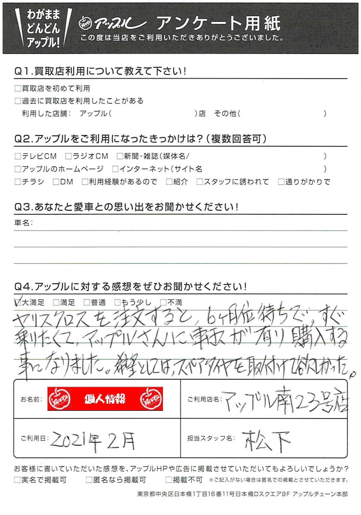 お車のご相談・ 査定だけでもOK! カンタン 入力 30秒 アップルがブランド買取始めました! お電話でも受付中! 受付時間10:00~19:00 052-619-3373 お車のご相談・ 査定だけでもOK! カンタン 入力 30秒 アップルがブランド買取始めました! お電話でも受付中! 受付時間10:00~19:00 052-619-3373 アップルがブランド買取始めました! お電話でも受付中! 受付時間10:00~19:00 052-619-3373 店舗情報 在庫車 スタッフ紹介 ブログ お客様の声 キャンペーン 無料査定 click お客様の声 ご記入日: 2021/02/01 匿名様 車名:トヨタ ヤリスクロス ヤリスクロスを注文すると6ヶ月位待ちで、すぐ乗りたくてアップルさんに車両が有り購入する事になりました。希望としては、スペアタイヤを取付けて欲しかった。 前へ 次へ お客様の声一覧を見る