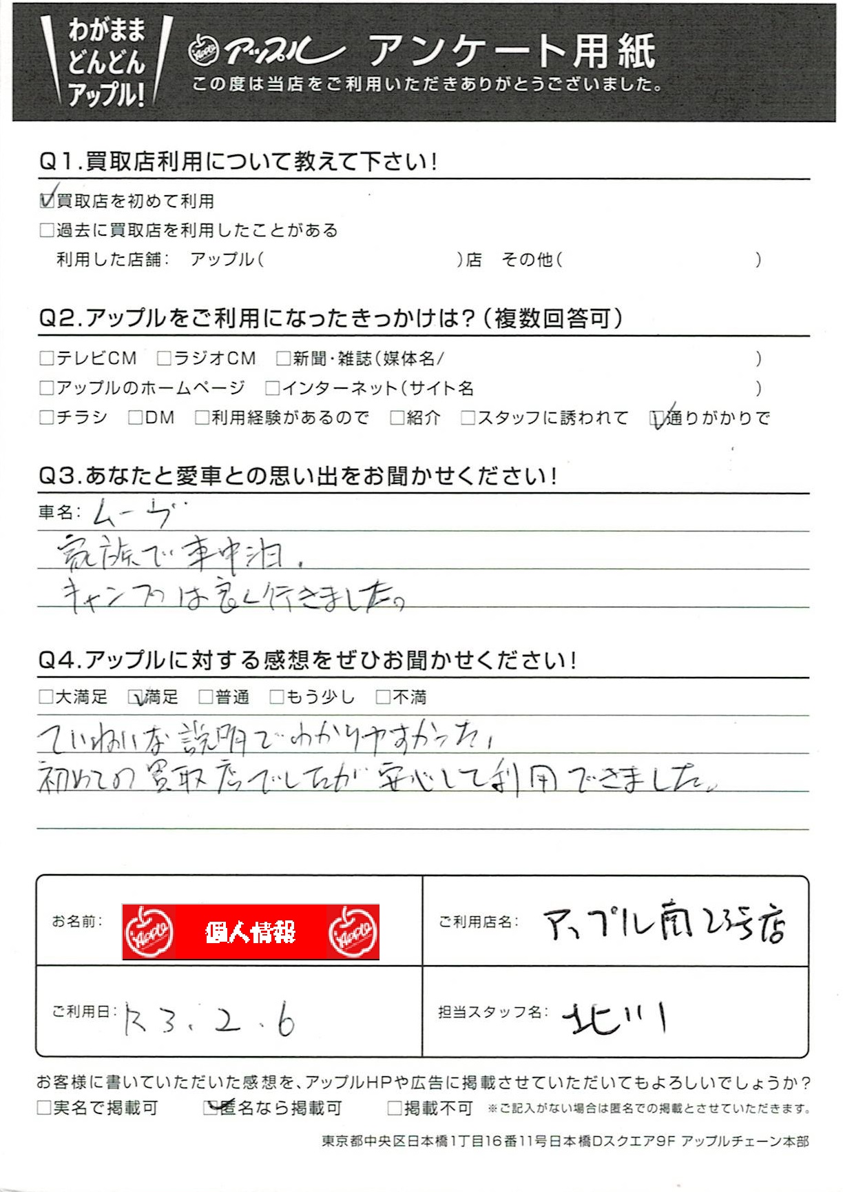 お車のご相談・ 査定だけでもOK! カンタン 入力 30秒 アップルがブランド買取始めました! お電話でも受付中! 受付時間10:00~19:00 052-619-3373 お車のご相談・ 査定だけでもOK! カンタン 入力 30秒 アップルがブランド買取始めました! お電話でも受付中! 受付時間10:00~19:00 052-619-3373 アップルがブランド買取始めました! お電話でも受付中! 受付時間10:00~19:00 052-619-3373 店舗情報 在庫車 スタッフ紹介 ブログ お客様の声 キャンペーン 無料査定 click お客様の声 ご記入日: 2021/02/06 匿名様 車名:ダイハツ ムーヴ ていねいな説明でわかりやすかった。初めての買取店でしたが安心して利用できました。 前へ 次へ お客様の声一覧を見る