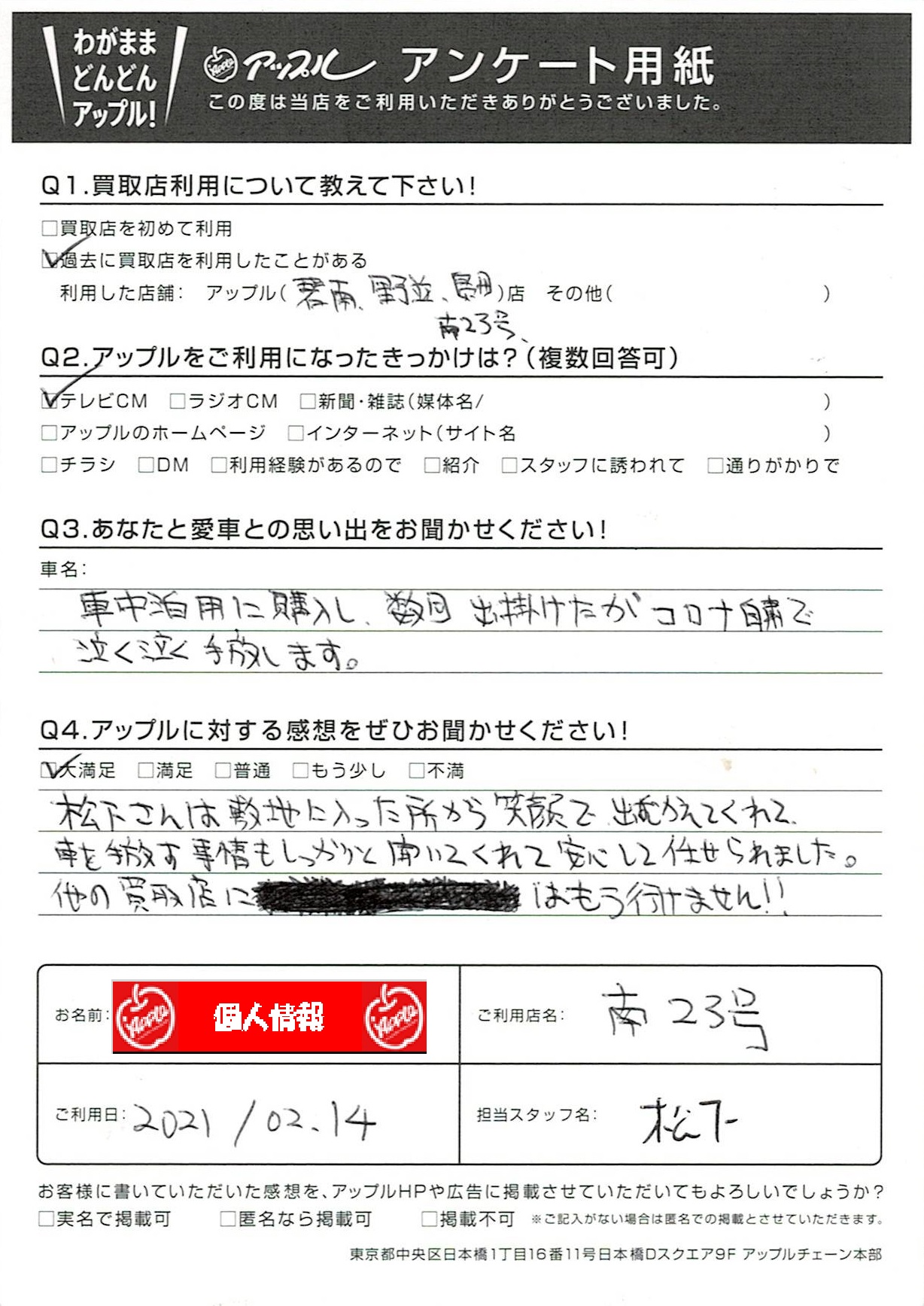 お車のご相談・ 査定だけでもOK! カンタン 入力 30秒 アップルがブランド買取始めました! お電話でも受付中! 受付時間10:00~19:00 052-619-3373 お車のご相談・ 査定だけでもOK! カンタン 入力 30秒 アップルがブランド買取始めました! お電話でも受付中! 受付時間10:00~19:00 052-619-3373 アップルがブランド買取始めました! お電話でも受付中! 受付時間10:00~19:00 052-619-3373 店舗情報 在庫車 スタッフ紹介 ブログ お客様の声 キャンペーン 無料査定 click お客様の声 ご記入日: 2021/02/14 匿名様 車名:トヨタ アルファード(H27年1月~のHYBRID含む) 松下さんは敷地に入った所から笑顔で出むかえてくれて、車を手放す事情もしっかりと聞いてくれて安心して任せられました。他の買取店にはもう行けません!! 前へ 次へ お客様の声一覧を見る