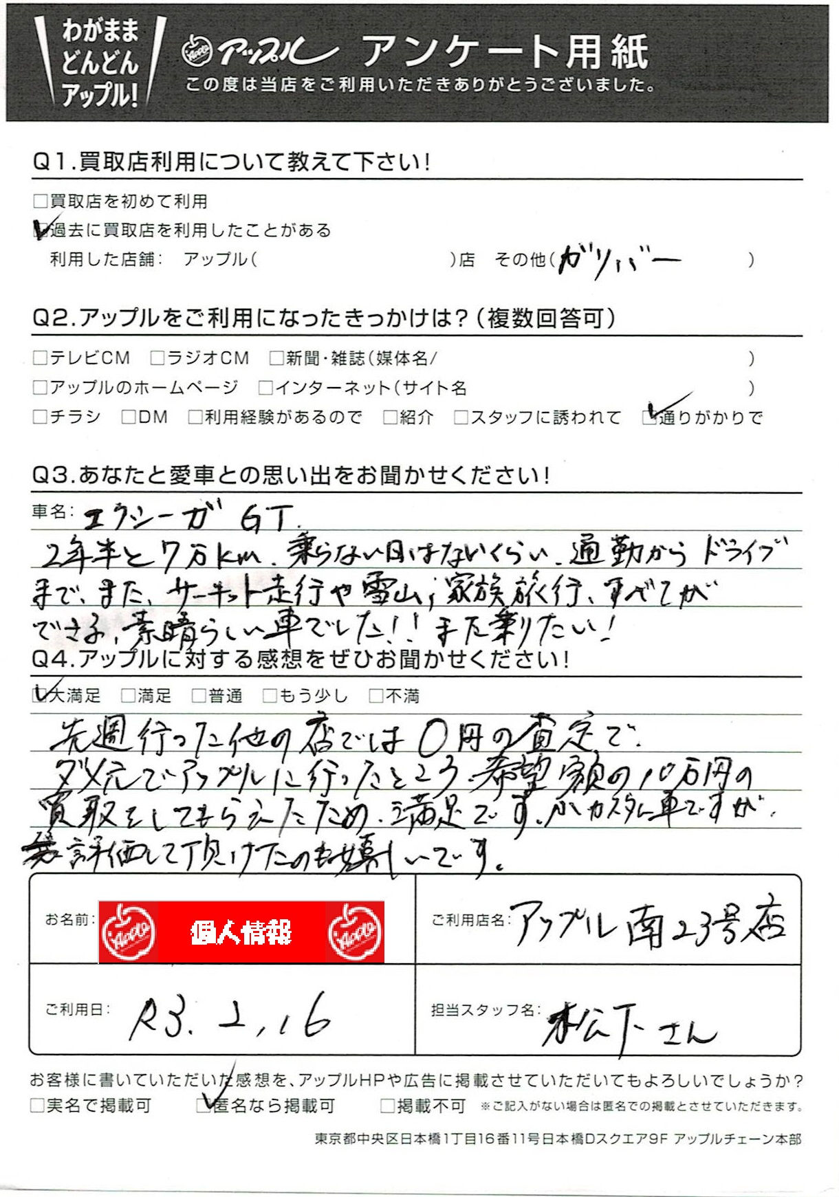 お車のご相談・ 査定だけでもOK! カンタン 入力 30秒 アップルがブランド買取始めました! お電話でも受付中! 受付時間10:00~19:00 052-619-3373 お車のご相談・ 査定だけでもOK! カンタン 入力 30秒 アップルがブランド買取始めました! お電話でも受付中! 受付時間10:00~19:00 052-619-3373 アップルがブランド買取始めました! お電話でも受付中! 受付時間10:00~19:00 052-619-3373 店舗情報 在庫車 スタッフ紹介 ブログ お客様の声 キャンペーン 無料査定 click お客様の声 ご記入日: 2021/02/16 匿名様 車名:スバル エクシーガ 先週行った他の店では0円の査定で、ダメ元でアップルに行ったところ、希望額の10万円の買取をしてもらえたため満足です。小カスタム車ですが、評価して頂けたのも嬉しいです。 前へ 次へ お客様の声一覧を見る