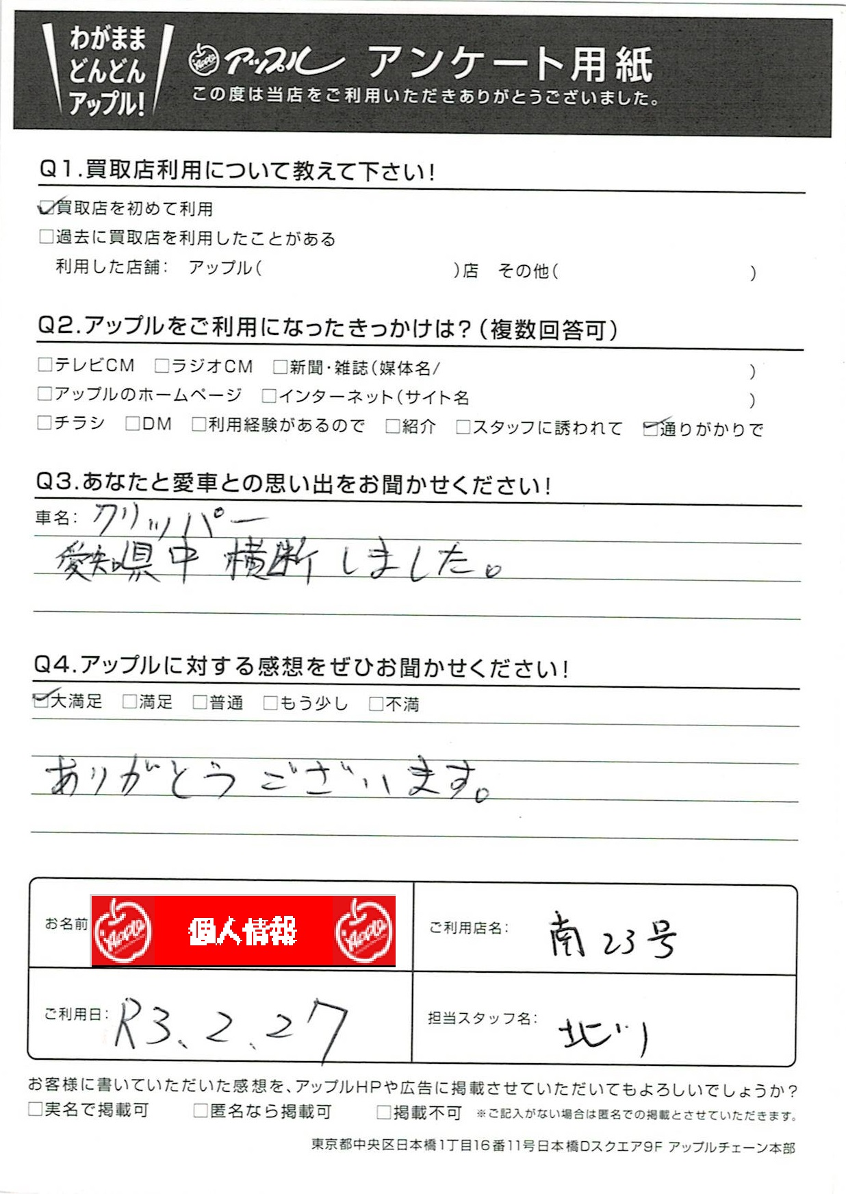お車のご相談・ 査定だけでもOK! カンタン 入力 30秒 アップルがブランド買取始めました! お電話でも受付中! 受付時間10:00~19:00 052-619-3373 お車のご相談・ 査定だけでもOK! カンタン 入力 30秒 アップルがブランド買取始めました! お電話でも受付中! 受付時間10:00~19:00 052-619-3373 アップルがブランド買取始めました! お電話でも受付中! 受付時間10:00~19:00 052-619-3373 店舗情報 在庫車 スタッフ紹介 ブログ お客様の声 キャンペーン 無料査定 click お客様の声 ご記入日: 2021/02/27 匿名様 車名:日産 クリッパー ありがとうございます。 前へ 次へ お客様の声一覧を見る