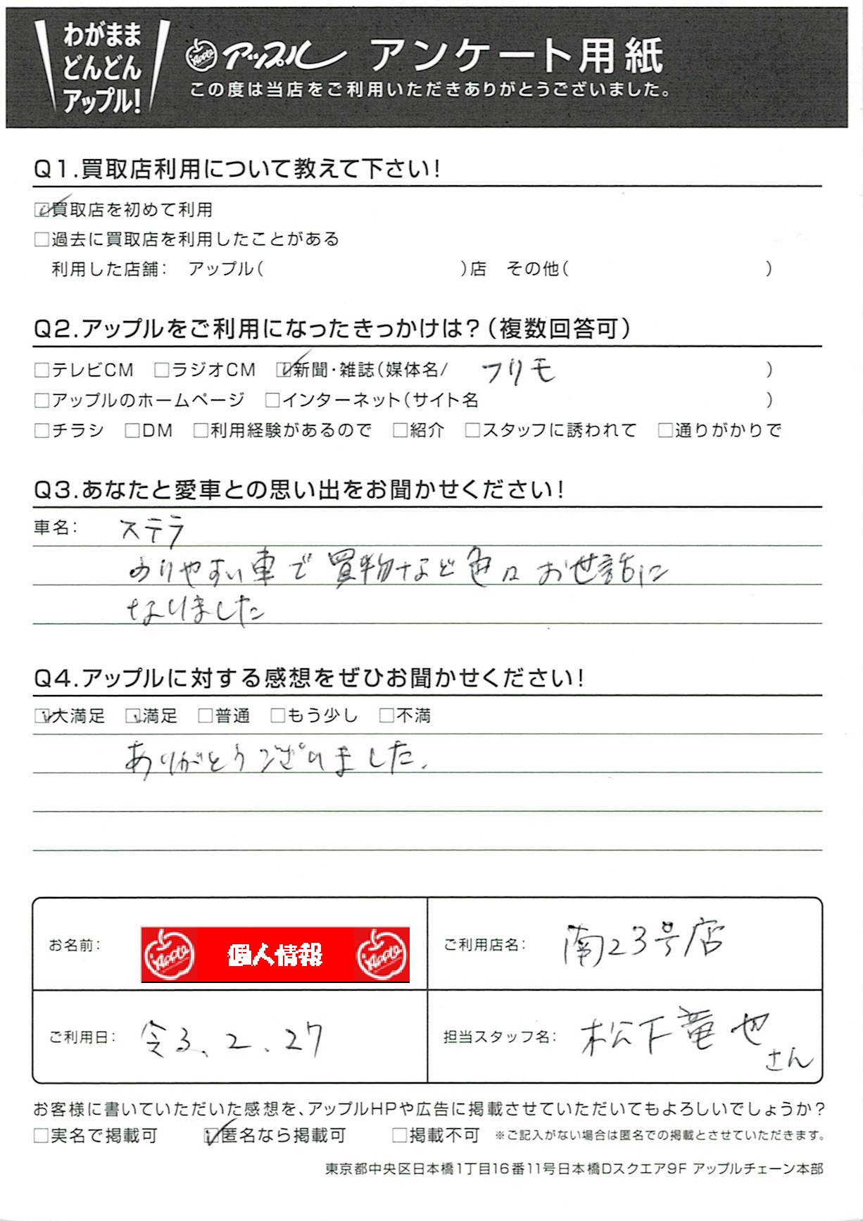 お車のご相談・ 査定だけでもOK! カンタン 入力 30秒 アップルがブランド買取始めました! お電話でも受付中! 受付時間10:00~19:00 052-619-3373 お車のご相談・ 査定だけでもOK! カンタン 入力 30秒 アップルがブランド買取始めました! お電話でも受付中! 受付時間10:00~19:00 052-619-3373 アップルがブランド買取始めました! お電話でも受付中! 受付時間10:00~19:00 052-619-3373 店舗情報 在庫車 スタッフ紹介 ブログ お客様の声 キャンペーン 無料査定 click お客様の声 ご記入日: 2021/02/27 匿名様 車名:スバル ステラ ありがとうございました。 前へ 次へ お客様の声一覧を見る