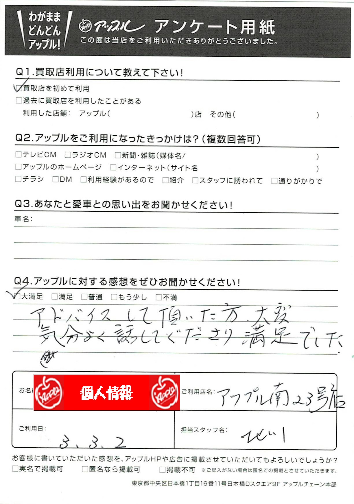 お車のご相談・ 査定だけでもOK! カンタン 入力 30秒 アップルがブランド買取始めました! お電話でも受付中! 受付時間10:00~19:00 052-619-3373 お車のご相談・ 査定だけでもOK! カンタン 入力 30秒 アップルがブランド買取始めました! お電話でも受付中! 受付時間10:00~19:00 052-619-3373 アップルがブランド買取始めました! お電話でも受付中! 受付時間10:00~19:00 052-619-3373 店舗情報 在庫車 スタッフ紹介 ブログ お客様の声 キャンペーン 無料査定 click お客様の声 ご記入日: 2021/03/02 匿名様 車名:スズキ MRワゴン アドバイスして頂いた方、大変気分よく話してくださり満足でした。 前へ 次へ お客様の声一覧を見る