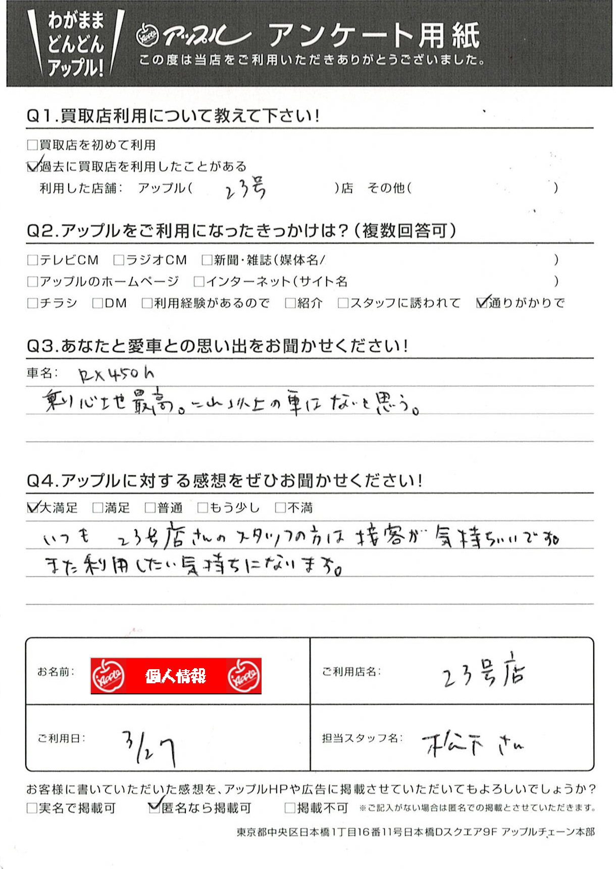 お車のご相談・ 査定だけでもOK! カンタン 入力 30秒 アップルがブランド買取始めました! お電話でも受付中! 受付時間10:00~19:00 052-619-3373 お車のご相談・ 査定だけでもOK! カンタン 入力 30秒 アップルがブランド買取始めました! お電話でも受付中! 受付時間10:00~19:00 052-619-3373 アップルがブランド買取始めました! お電話でも受付中! 受付時間10:00~19:00 052-619-3373 店舗情報 在庫車 スタッフ紹介 ブログ お客様の声 キャンペーン 無料査定 click お客様の声 ご記入日: 2021/03/27 匿名様 車名:レクサス RXハイブリッド(国内仕様 H27年9月迄) いつも南23号店さんのスタッフの方は接客が気持ちいいです。また利用したい気持ちになります。 前へ 次へ お客様の声一覧を見る
