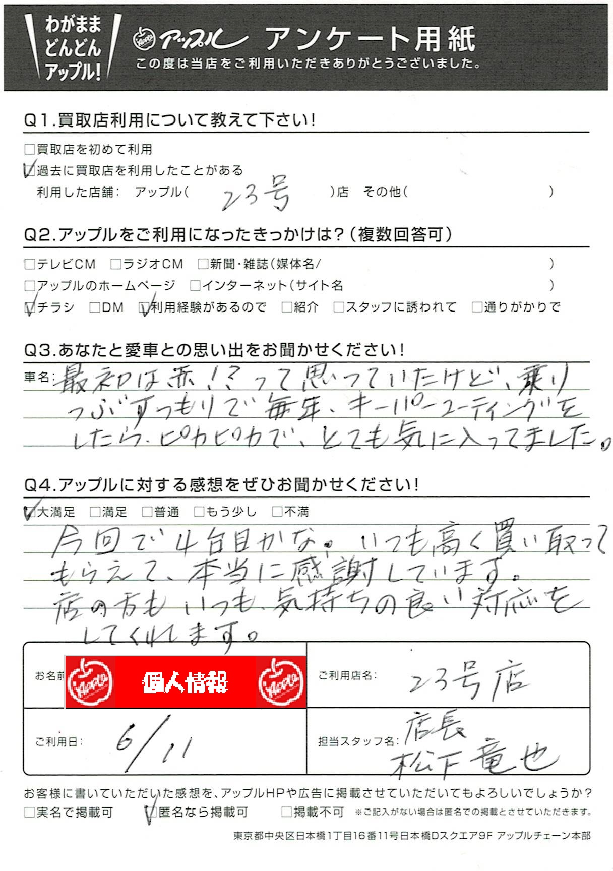 お車のご相談・ 査定だけでもOK! カンタン 入力 30秒 アップルがブランド買取始めました! お電話でも受付中! 受付時間10:00~19:00 052-619-3373 お車のご相談・ 査定だけでもOK! カンタン 入力 30秒 アップルがブランド買取始めました! お電話でも受付中! 受付時間10:00~19:00 052-619-3373 アップルがブランド買取始めました! お電話でも受付中! 受付時間10:00~19:00 052-619-3373 店舗情報 在庫車 スタッフ紹介 ブログ お客様の声 キャンペーン 無料査定 click お客様の声 ご記入日: 2021/06/11 匿名様 車名:トヨタ アクア 今回で4台目かな。いつも高く買い取ってもらえて、本当に感謝しています。店の方もいつも気持ちの良い対応をしてくれます。 前へ 次へ お客様の声一覧を見る