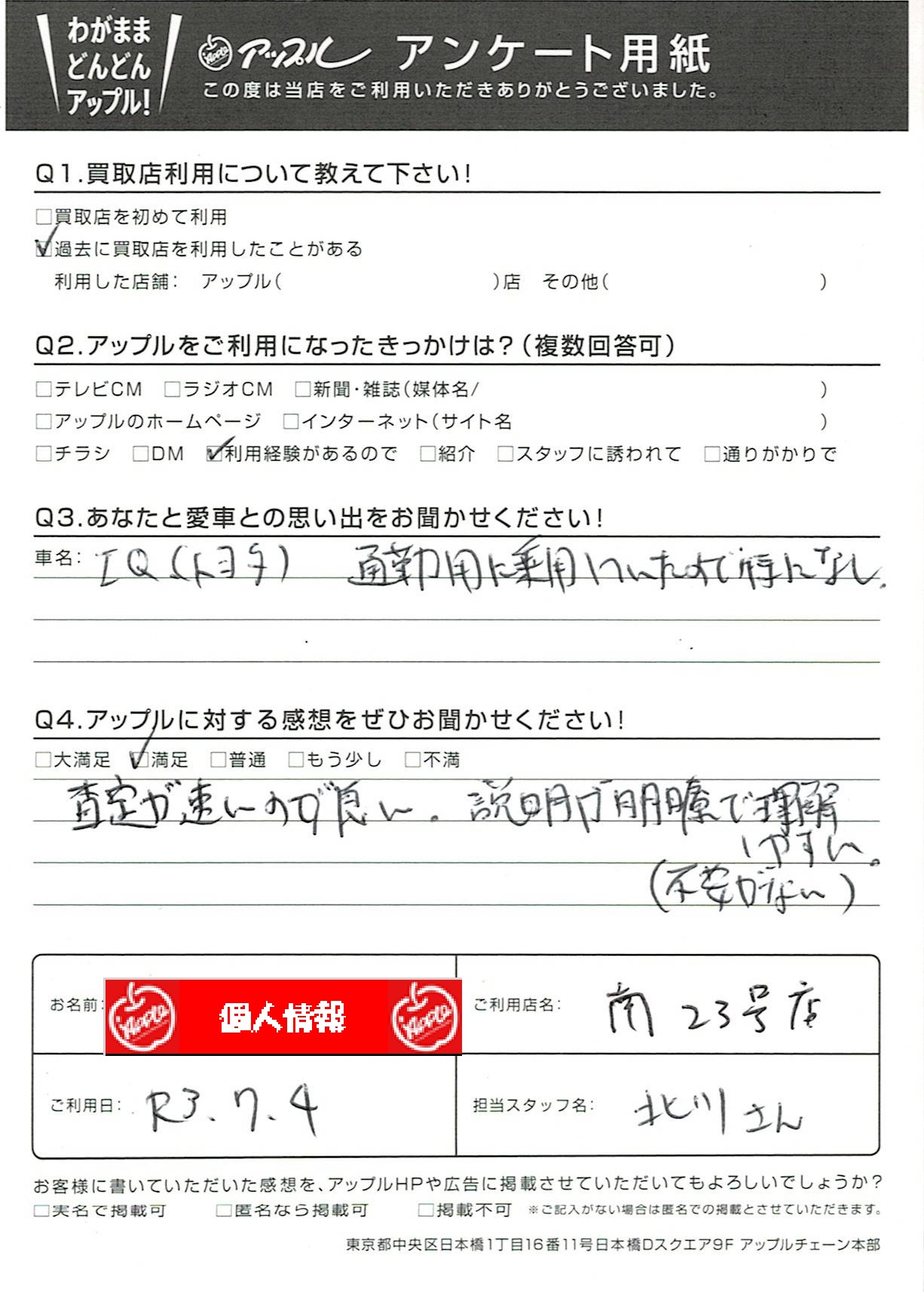 お車のご相談・ 査定だけでもOK! カンタン 入力 30秒 アップルがブランド買取始めました! お電話でも受付中! 受付時間10:00~19:00 052-619-3373 お車のご相談・ 査定だけでもOK! カンタン 入力 30秒 アップルがブランド買取始めました! お電話でも受付中! 受付時間10:00~19:00 052-619-3373 アップルがブランド買取始めました! お電話でも受付中! 受付時間10:00~19:00 052-619-3373 店舗情報 在庫車 スタッフ紹介 ブログ お客様の声 キャンペーン 無料査定 click お客様の声 ご記入日: 2021/07/04 匿名様 車名:トヨタ iQ 査定が速いのが良い。説明が明瞭で理解しやすい。(不安がない) 前へ 次へ お客様の声一覧を見る