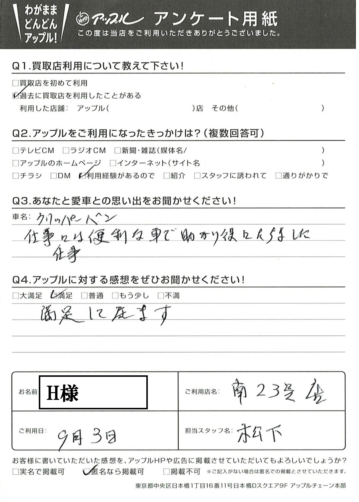 お車のご相談・ 査定だけでもOK! カンタン 入力 30秒 アップルがブランド買取始めました! お電話でも受付中! 受付時間10:00~19:00 052-619-3373 お車のご相談・ 査定だけでもOK! カンタン 入力 30秒 アップルがブランド買取始めました! お電話でも受付中! 受付時間10:00~19:00 052-619-3373 アップルがブランド買取始めました! お電話でも受付中! 受付時間10:00~19:00 052-619-3373 店舗情報 在庫車 スタッフ紹介 ブログ お客様の声 キャンペーン 無料査定 click お客様の声 ご記入日: 2021/09/03 H様 車名:日産 NV100クリッパー 満足して居ます 前へ 次へ お客様の声一覧を見る