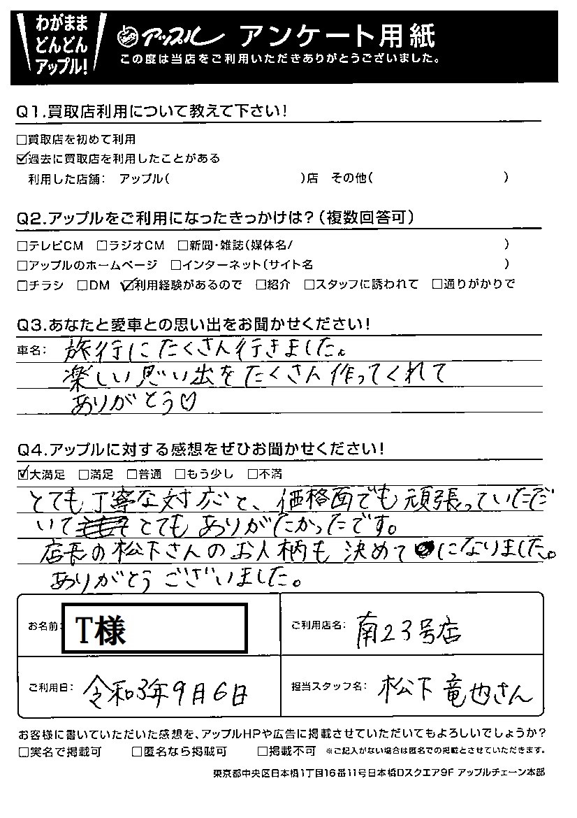 お車のご相談・ 査定だけでもOK! カンタン 入力 30秒 アップルがブランド買取始めました! お電話でも受付中! 受付時間10:00~19:00 052-619-3373 お車のご相談・ 査定だけでもOK! カンタン 入力 30秒 アップルがブランド買取始めました! お電話でも受付中! 受付時間10:00~19:00 052-619-3373 アップルがブランド買取始めました! お電話でも受付中! 受付時間10:00~19:00 052-619-3373 店舗情報 在庫車 スタッフ紹介 ブログ お客様の声 キャンペーン 無料査定 click お客様の声 ご記入日: 2021/09/06 T様 車名:BMW X6 とても丁寧な対応と、価格面でも頑張っていただいてとてもありがたかったです。店長の松下さんのお人柄も決めてになりました。ありがとうございました。 前へ 次へ お客様の声一覧を見る