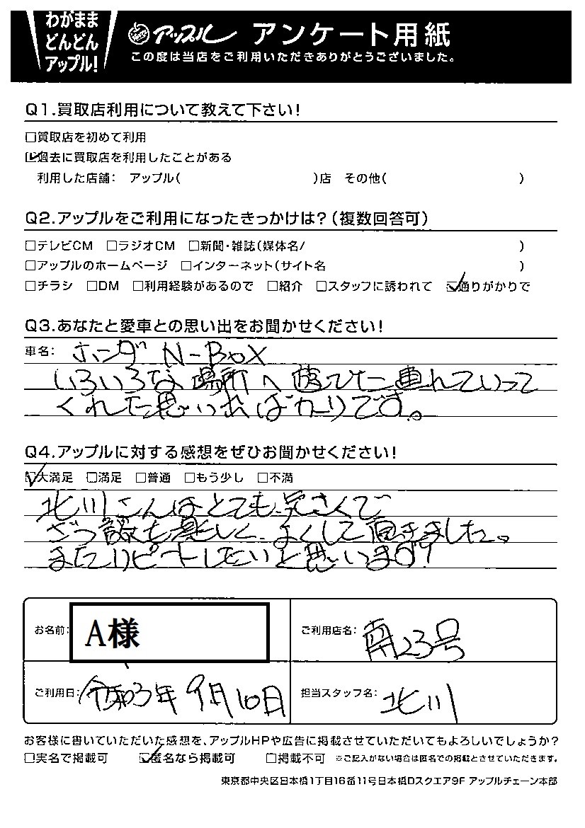 お車のご相談・ 査定だけでもOK! カンタン 入力 30秒 アップルがブランド買取始めました! お電話でも受付中! 受付時間10:00~19:00 052-619-3373 お車のご相談・ 査定だけでもOK! カンタン 入力 30秒 アップルがブランド買取始めました! お電話でも受付中! 受付時間10:00~19:00 052-619-3373 アップルがブランド買取始めました! お電話でも受付中! 受付時間10:00~19:00 052-619-3373 店舗情報 在庫車 スタッフ紹介 ブログ お客様の声 キャンペーン 無料査定 click お客様の声 ご記入日: 2021/09/10 A様 車名:ホンダ N-BOX 北川さんはとても気さくで雑談も楽しく、よくして頂きました。またリピートしたいと思います! 前へ 次へ お客様の声一覧を見る