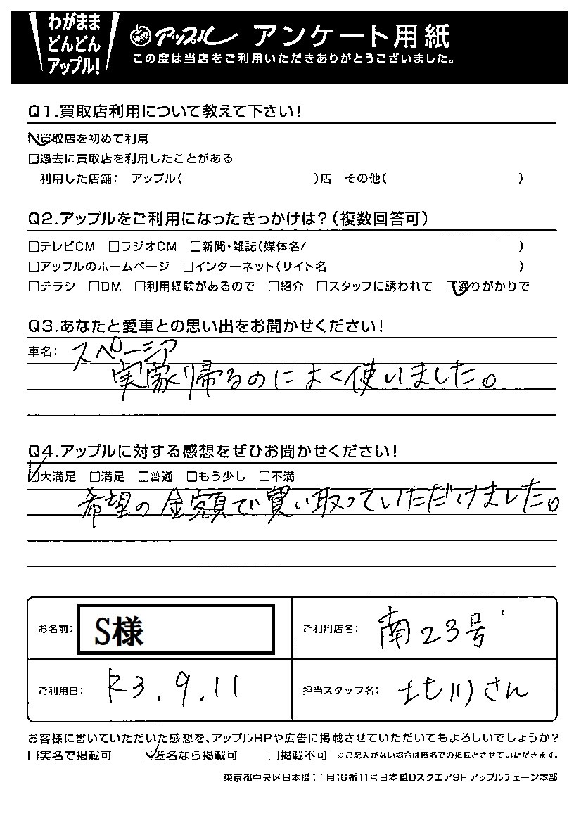 お車のご相談・ 査定だけでもOK! カンタン 入力 30秒 アップルがブランド買取始めました! お電話でも受付中! 受付時間10:00~19:00 052-619-3373 お車のご相談・ 査定だけでもOK! カンタン 入力 30秒 アップルがブランド買取始めました! お電話でも受付中! 受付時間10:00~19:00 052-619-3373 アップルがブランド買取始めました! お電話でも受付中! 受付時間10:00~19:00 052-619-3373 店舗情報 在庫車 スタッフ紹介 ブログ お客様の声 キャンペーン 無料査定 click お客様の声 ご記入日: 2021/09/11 S様 車名:スズキ スペーシア 希望の金額で買い取っていただけました。 前へ 次へ お客様の声一覧を見る