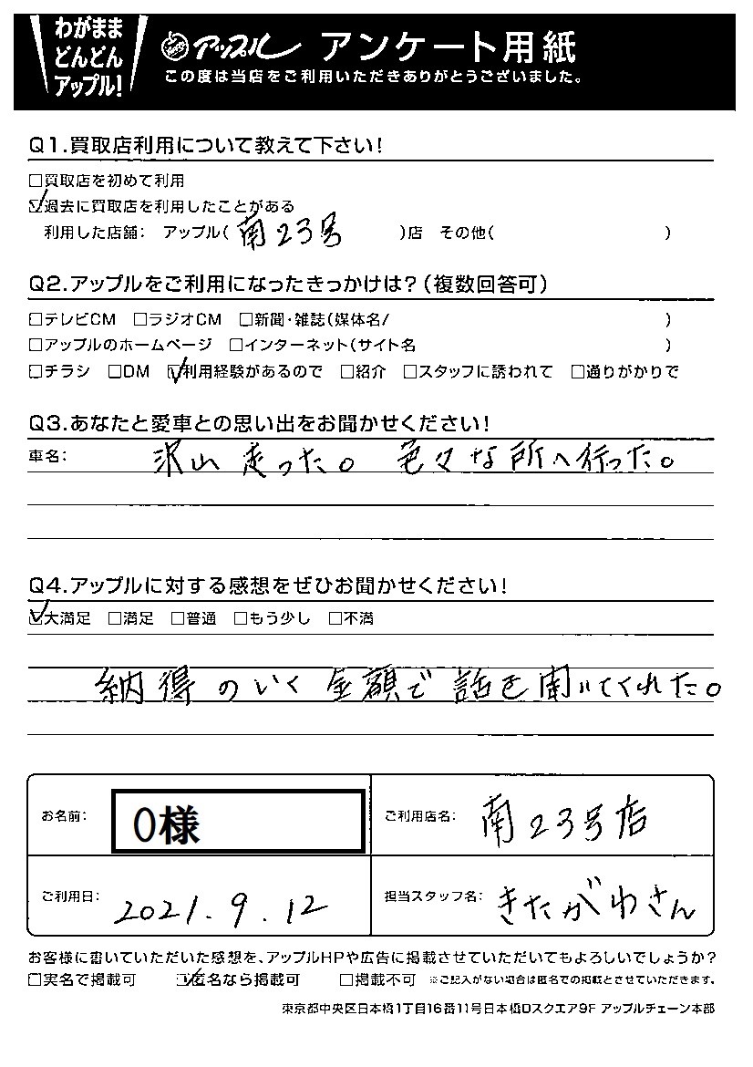 お車のご相談・ 査定だけでもOK! カンタン 入力 30秒 アップルがブランド買取始めました! お電話でも受付中! 受付時間10:00~19:00 052-619-3373 お車のご相談・ 査定だけでもOK! カンタン 入力 30秒 アップルがブランド買取始めました! お電話でも受付中! 受付時間10:00~19:00 052-619-3373 アップルがブランド買取始めました! お電話でも受付中! 受付時間10:00~19:00 052-619-3373 店舗情報 在庫車 スタッフ紹介 ブログ お客様の声 キャンペーン 無料査定 click お客様の声 ご記入日: 2021/09/12 O様 車名:ダイハツ タント 納得のいく金額で話を聞いてくれた。 前へ 次へ お客様の声一覧を見る