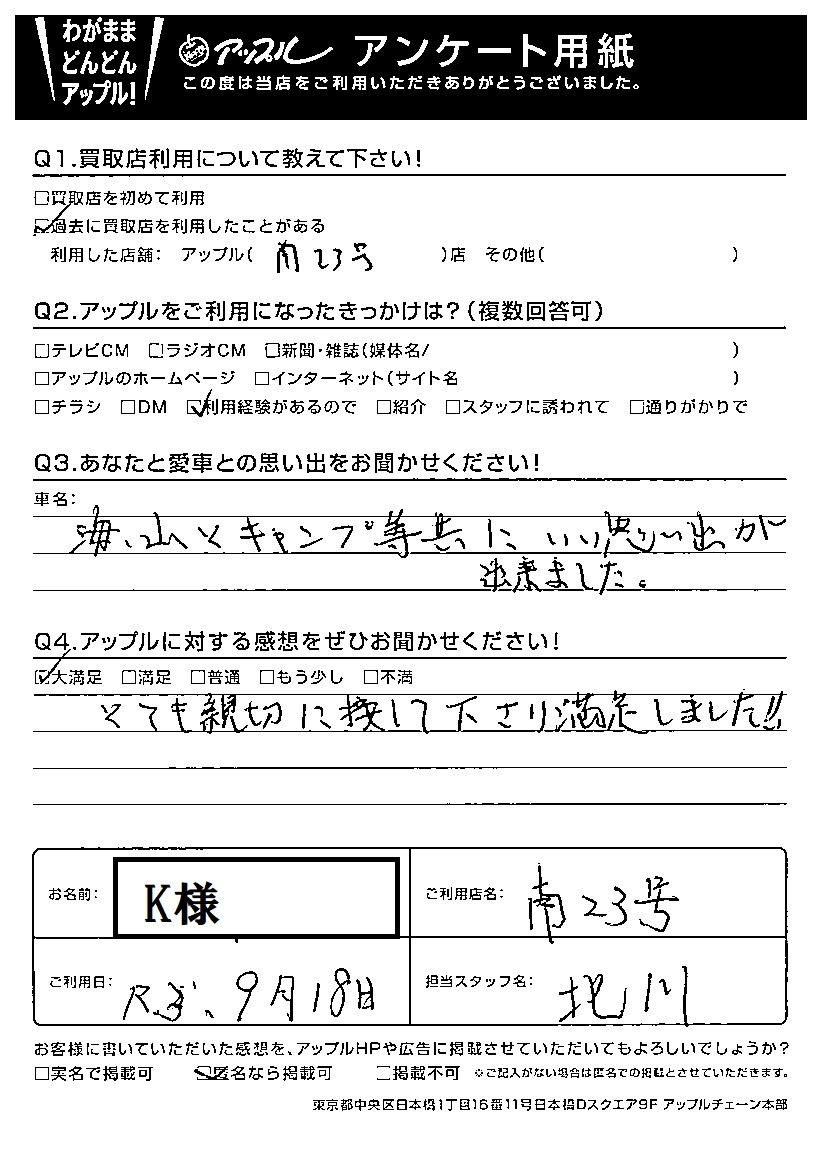 お車のご相談・ 査定だけでもOK! カンタン 入力 30秒 アップルがブランド買取始めました! お電話でも受付中! 受付時間10:00~19:00 052-619-3373 お車のご相談・ 査定だけでもOK! カンタン 入力 30秒 アップルがブランド買取始めました! お電話でも受付中! 受付時間10:00~19:00 052-619-3373 アップルがブランド買取始めました! お電話でも受付中! 受付時間10:00~19:00 052-619-3373 店舗情報 在庫車 スタッフ紹介 ブログ お客様の声 キャンペーン 無料査定 click お客様の声 ご記入日: 2021/09/18 K様 車名:ダイハツ タント とても親切に接して下さり満足しました!! 前へ 次へ お客様の声一覧を見る