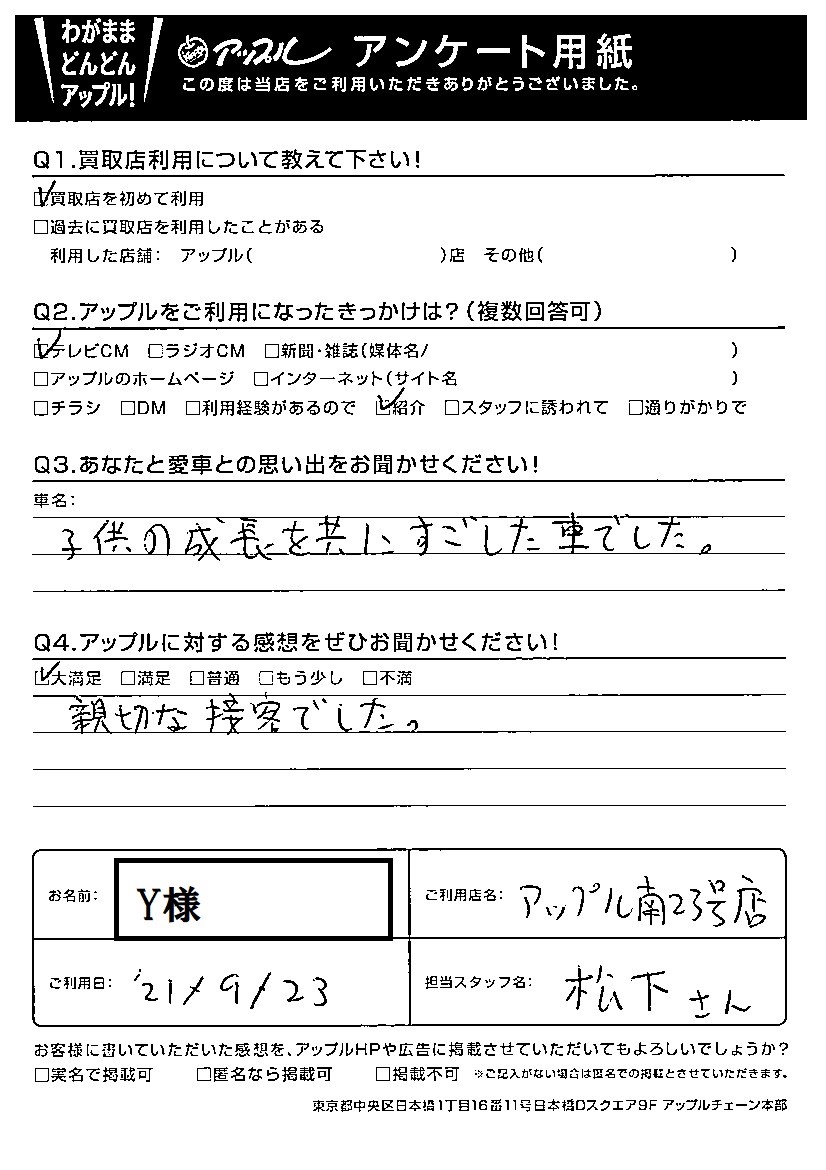 お車のご相談・ 査定だけでもOK! カンタン 入力 30秒 アップルがブランド買取始めました! お電話でも受付中! 受付時間10:00~19:00 052-619-3373 お車のご相談・ 査定だけでもOK! カンタン 入力 30秒 アップルがブランド買取始めました! お電話でも受付中! 受付時間10:00~19:00 052-619-3373 アップルがブランド買取始めました! お電話でも受付中! 受付時間10:00~19:00 052-619-3373 店舗情報 在庫車 スタッフ紹介 ブログ お客様の声 キャンペーン 無料査定 click お客様の声 ご記入日: 2021/09/23 Y様 車名:トヨタ ノア 親切な接客でした。 前へ 次へ お客様の声一覧を見る