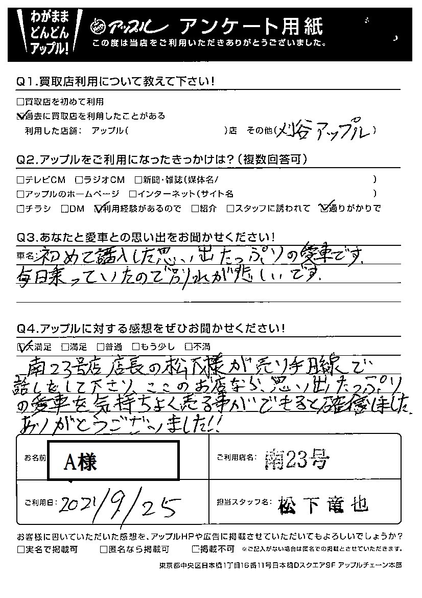 お車のご相談・ 査定だけでもOK! カンタン 入力 30秒 アップルがブランド買取始めました! お電話でも受付中! 受付時間10:00~19:00 052-619-3373 お車のご相談・ 査定だけでもOK! カンタン 入力 30秒 アップルがブランド買取始めました! お電話でも受付中! 受付時間10:00~19:00 052-619-3373 アップルがブランド買取始めました! お電話でも受付中! 受付時間10:00~19:00 052-619-3373 店舗情報 在庫車 スタッフ紹介 ブログ お客様の声 キャンペーン 無料査定 click お客様の声 ご記入日: 2021/09/25 A様 車名:トヨタ オーリス 南23号店 店長の松下様が売り手目線で話しをして下さり、ここのお店なら、思い出たっぷりの愛車を気持ちよく売る事ができると確信しました。ありがとうございました!! 前へ 次へ お客様の声一覧を見る