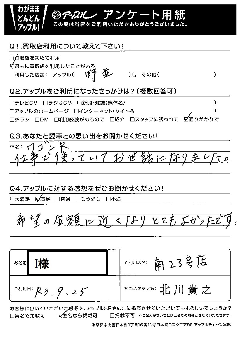 お車のご相談・ 査定だけでもOK! カンタン 入力 30秒 アップルがブランド買取始めました! お電話でも受付中! 受付時間10:00~19:00 052-619-3373 お車のご相談・ 査定だけでもOK! カンタン 入力 30秒 アップルがブランド買取始めました! お電話でも受付中! 受付時間10:00~19:00 052-619-3373 アップルがブランド買取始めました! お電話でも受付中! 受付時間10:00~19:00 052-619-3373 店舗情報 在庫車 スタッフ紹介 ブログ お客様の声 キャンペーン 無料査定 click お客様の声 ご記入日: 2021/09/25 I様 車名:スズキ ワゴンR 希望の金額に近くなりとてもよかったです。 前へ 次へ お客様の声一覧を見る