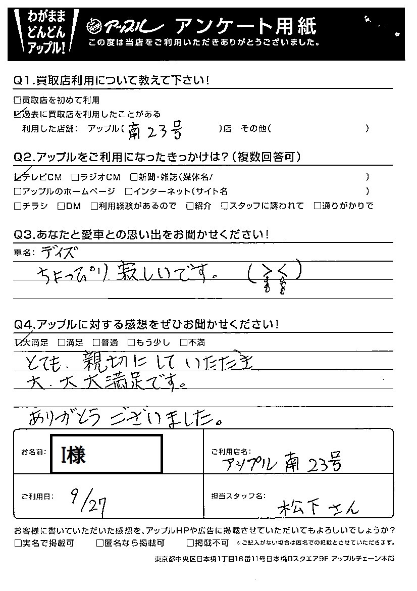 お車のご相談・ 査定だけでもOK! カンタン 入力 30秒 アップルがブランド買取始めました! お電話でも受付中! 受付時間10:00~19:00 052-619-3373 お車のご相談・ 査定だけでもOK! カンタン 入力 30秒 アップルがブランド買取始めました! お電話でも受付中! 受付時間10:00~19:00 052-619-3373 アップルがブランド買取始めました! お電話でも受付中! 受付時間10:00~19:00 052-619-3373 店舗情報 在庫車 スタッフ紹介 ブログ お客様の声 キャンペーン 無料査定 click お客様の声 ご記入日: 2021/09/27 I様 車名:日産 デイズ とても、親切にしていただき大、大 大満足です。ありがとうございました。 前へ 次へ お客様の声一覧を見る