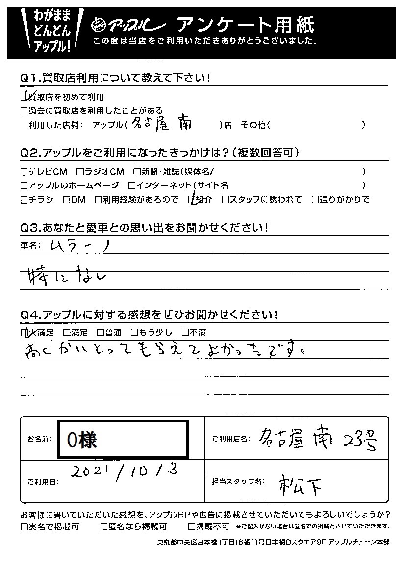 お車のご相談・ 査定だけでもOK! カンタン 入力 30秒 アップルがブランド買取始めました! お電話でも受付中! 受付時間10:00~19:00 052-619-3373 お車のご相談・ 査定だけでもOK! カンタン 入力 30秒 アップルがブランド買取始めました! お電話でも受付中! 受付時間10:00~19:00 052-619-3373 アップルがブランド買取始めました! お電話でも受付中! 受付時間10:00~19:00 052-619-3373 店舗情報 在庫車 スタッフ紹介 ブログ お客様の声 キャンペーン 無料査定 click お客様の声 ご記入日: 2021/10/03 O様 車名:日産 ムラーノ 高くかいとってもらえてよかったです。 前へ 次へ お客様の声一覧を見る