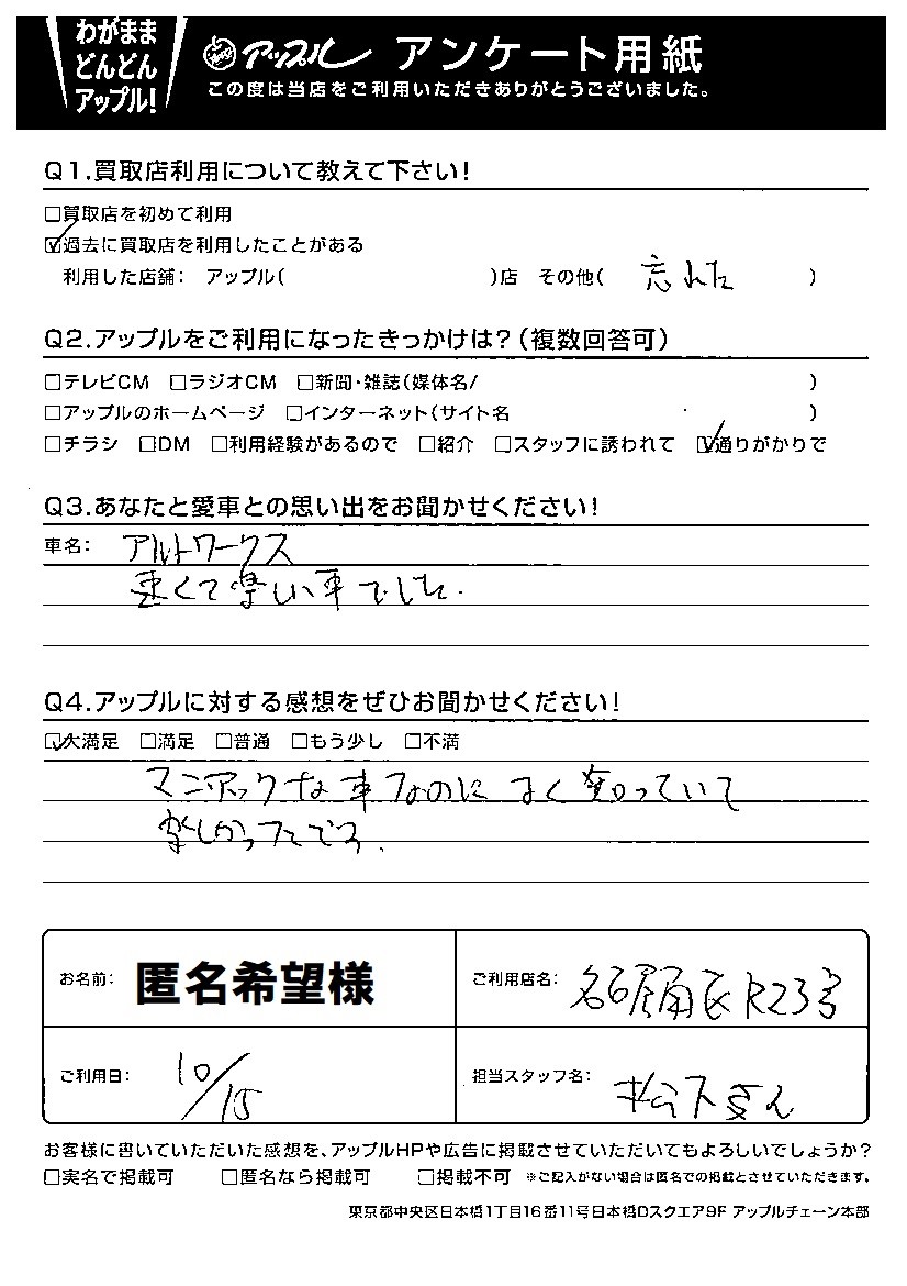 お車のご相談・ 査定だけでもOK! カンタン 入力 30秒 アップルがブランド買取始めました! お電話でも受付中! 受付時間10:00~19:00 052-619-3373 お車のご相談・ 査定だけでもOK! カンタン 入力 30秒 アップルがブランド買取始めました! お電話でも受付中! 受付時間10:00~19:00 052-619-3373 アップルがブランド買取始めました! お電話でも受付中! 受付時間10:00~19:00 052-619-3373 店舗情報 在庫車 スタッフ紹介 ブログ お客様の声 キャンペーン 無料査定 click お客様の声 ご記入日: 2021/10/15 I様 車名:スズキ アルト (2015年12月以降のワークス含む) マニアックな車なのによく知っていて楽しかったです。 前へ 次へ お客様の声一覧を見る