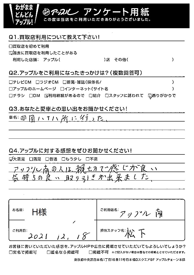 お車のご相談・ 査定だけでもOK! カンタン 入力 30秒 アップルがブランド買取始めました! お電話でも受付中! 受付時間10:00~19:00 052-619-3373 お車のご相談・ 査定だけでもOK! カンタン 入力 30秒 アップルがブランド買取始めました! お電話でも受付中! 受付時間10:00~19:00 052-619-3373 アップルがブランド買取始めました! お電話でも受付中! 受付時間10:00~19:00 052-619-3373 店舗情報 在庫車 スタッフ紹介 ブログ お客様の声 キャンペーン 無料査定 click お客様の声 ご記入日: 2021/12/18 H様 車名:ホンダ N-BOX アップル南の人は、親切で感じが良い気持ちの良い取り引きが出来ました。 前へ 次へ お客様の声一覧を見る