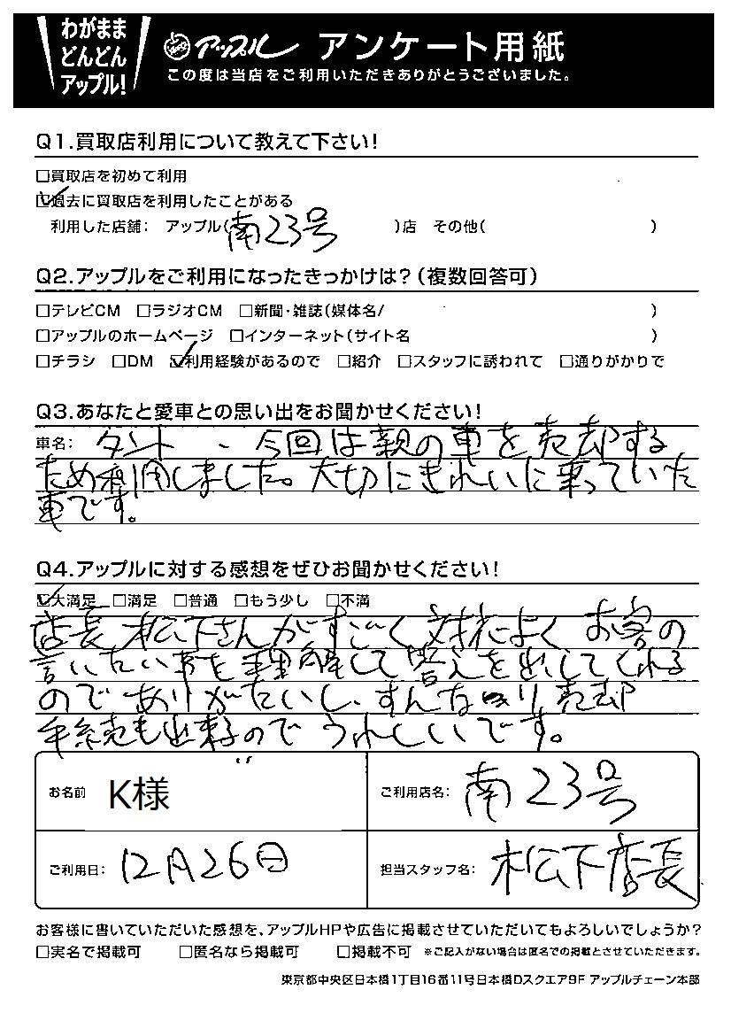 お車のご相談・ 査定だけでもOK! カンタン 入力 30秒 アップルがブランド買取始めました! お電話でも受付中! 受付時間10:00~19:00 052-619-3373 お車のご相談・ 査定だけでもOK! カンタン 入力 30秒 アップルがブランド買取始めました! お電話でも受付中! 受付時間10:00~19:00 052-619-3373 アップルがブランド買取始めました! お電話でも受付中! 受付時間10:00~19:00 052-619-3373 店舗情報 在庫車 スタッフ紹介 ブログ お客様の声 キャンペーン 無料査定 click お客様の声 ご記入日: 2021/12/26 K様 車名:ダイハツ タント 店長松下さんがすごく対応よく、お客の言いたい事を理解して答えを出してくれるのでありがたいし、すんなり売却手続も出来るのでうれしいです。 前へ 次へ お客様の声一覧を見る