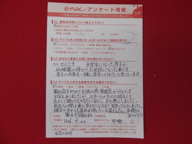 買取店を初めて利用の為雰囲気が分からず不安もありましたが、スタッフの方々の明るくて気さくで親切な対応に安心し、また感心しました。見送りの際は車が見えなくなるまで見送って下さいました。機会があれば是非利用したいお店でした。中﨑さんありがとう!!