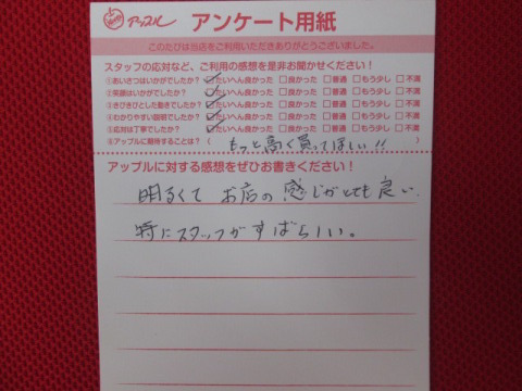 お車のご相談・ 査定だけでもOK! カンタン 入力 30秒 アップルがブランド買取始めました! お電話でも受付中! 受付時間10:00~19:00 052-619-3373 お車のご相談・ 査定だけでもOK! カンタン 入力 30秒 アップルがブランド買取始めました! お電話でも受付中! 受付時間10:00~19:00 052-619-3373 アップルがブランド買取始めました! お電話でも受付中! 受付時間10:00~19:00 052-619-3373 店舗情報 在庫車 スタッフ紹介 ブログ お客様の声 キャンペーン 無料査定 click お客様の声 ご記入日: 2013/09/27 匿名希望様 明るくてお店の幹事がとても良い。特にスタッフがすばらしい。 前へ 次へ お客様の声一覧を見る