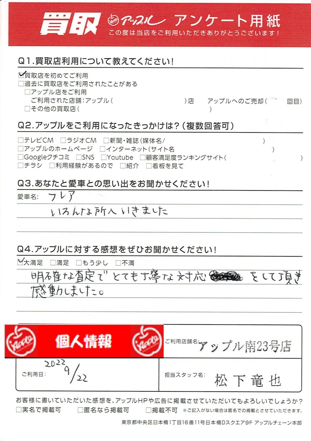 お車のご相談・ 査定だけでもOK! カンタン 入力 30秒 アップルがブランド買取始めました! お電話でも受付中! 受付時間10:00~19:00 052-619-3373 お車のご相談・ 査定だけでもOK! カンタン 入力 30秒 アップルがブランド買取始めました! お電話でも受付中! 受付時間10:00~19:00 052-619-3373 アップルがブランド買取始めました! お電話でも受付中! 受付時間10:00~19:00 052-619-3373 店舗情報 在庫車 スタッフ紹介 ブログ お客様の声 キャンペーン 無料査定 click お客様の声 ご記入日: 2022/09/22 N様 車名:マツダ フレア 明確な査定でとても丁寧な対応をして頂き感動しました。 前へ 次へ お客様の声一覧を見る