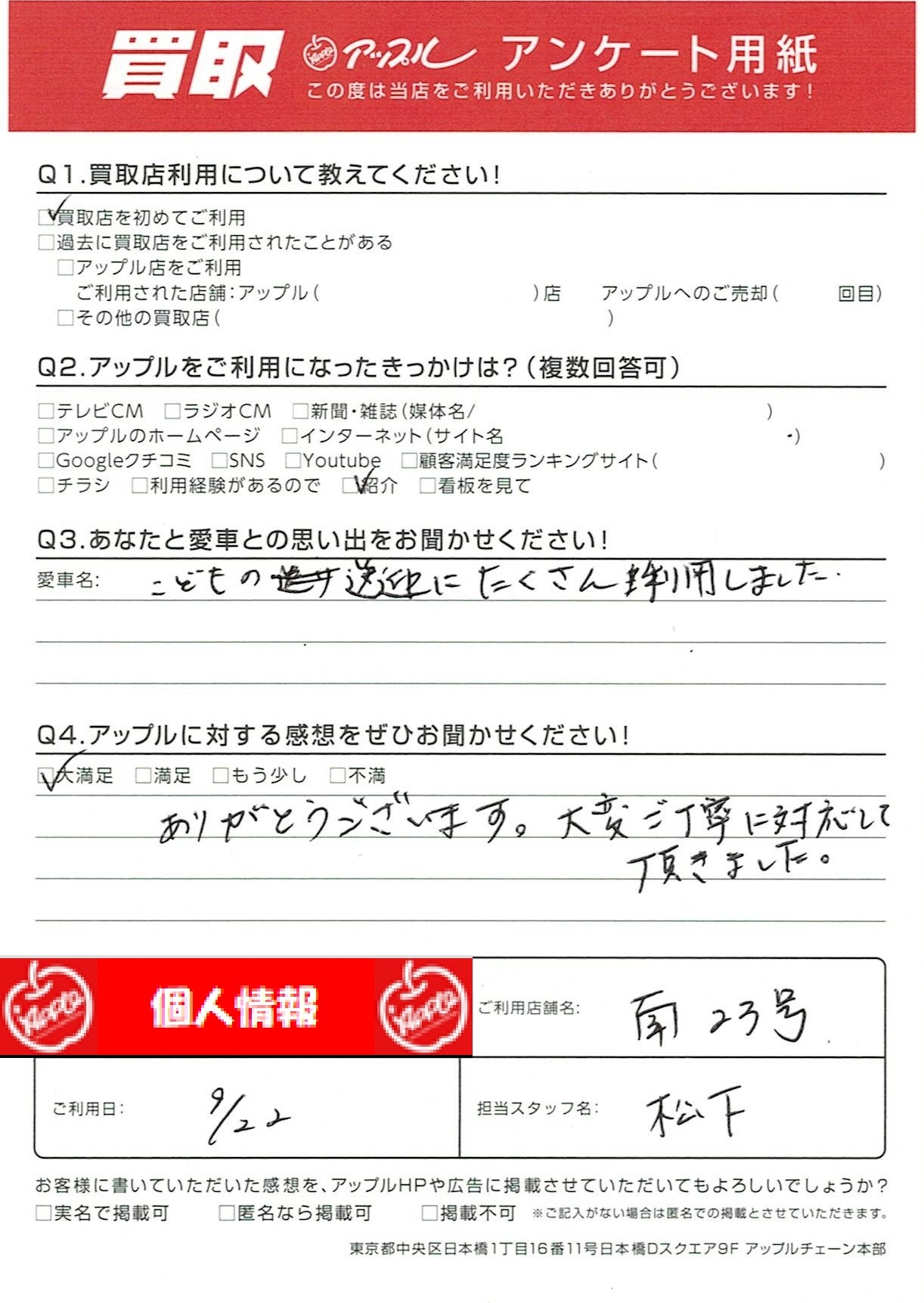 お車のご相談・ 査定だけでもOK! カンタン 入力 30秒 アップルがブランド買取始めました! お電話でも受付中! 受付時間10:00~19:00 052-619-3373 お車のご相談・ 査定だけでもOK! カンタン 入力 30秒 アップルがブランド買取始めました! お電話でも受付中! 受付時間10:00~19:00 052-619-3373 アップルがブランド買取始めました! お電話でも受付中! 受付時間10:00~19:00 052-619-3373 店舗情報 在庫車 スタッフ紹介 ブログ お客様の声 キャンペーン 無料査定 click お客様の声 ご記入日: 2022/09/22 H様 ありがとうございます。大変ご丁寧に対応して頂きました。 前へ 次へ お客様の声一覧を見る