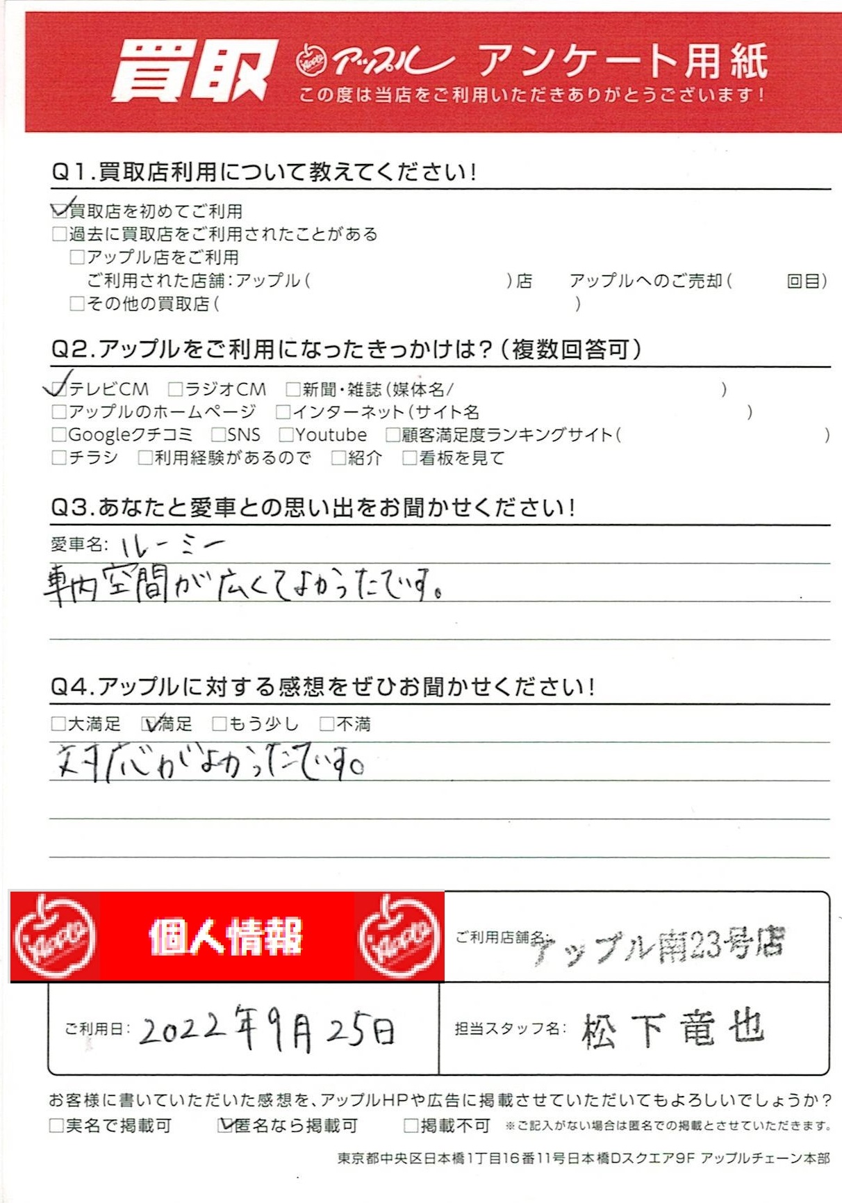 お車のご相談・ 査定だけでもOK! カンタン 入力 30秒 アップルがブランド買取始めました! お電話でも受付中! 受付時間10:00~19:00 052-619-3373 お車のご相談・ 査定だけでもOK! カンタン 入力 30秒 アップルがブランド買取始めました! お電話でも受付中! 受付時間10:00~19:00 052-619-3373 アップルがブランド買取始めました! お電話でも受付中! 受付時間10:00~19:00 052-619-3373 店舗情報 在庫車 スタッフ紹介 ブログ お客様の声 キャンペーン 無料査定 click お客様の声 ご記入日: 2022/09/25 M様 車名:トヨタ ルーミー 対応がよかったです。 前へ 次へ お客様の声一覧を見る