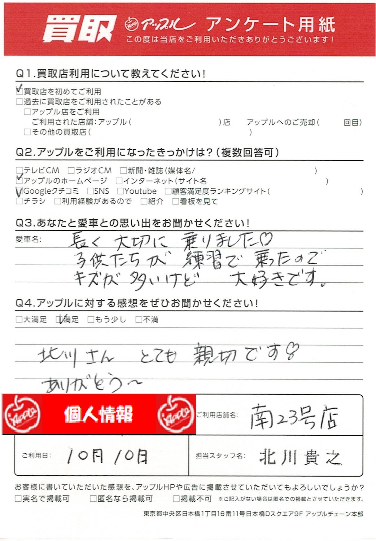 お車のご相談・ 査定だけでもOK! カンタン 入力 30秒 アップルがブランド買取始めました! お電話でも受付中! 受付時間10:00~19:00 052-619-3373 お車のご相談・ 査定だけでもOK! カンタン 入力 30秒 アップルがブランド買取始めました! お電話でも受付中! 受付時間10:00~19:00 052-619-3373 アップルがブランド買取始めました! お電話でも受付中! 受付時間10:00~19:00 052-619-3373 店舗情報 在庫車 スタッフ紹介 ブログ お客様の声 キャンペーン 無料査定 click お客様の声 ご記入日: 2022/10/10 K様 北川さん とても親切です♡ありがとう~ 前へ 次へ お客様の声一覧を見る