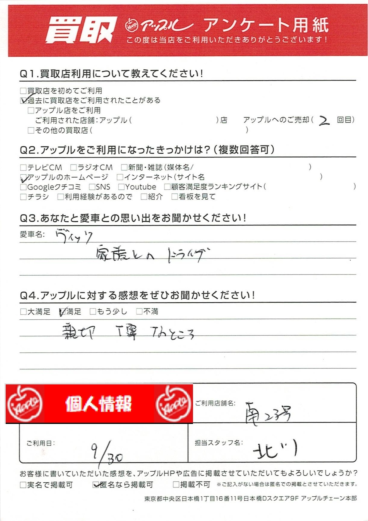 お車のご相談・ 査定だけでもOK! カンタン 入力 30秒 アップルがブランド買取始めました! お電話でも受付中! 受付時間10:00~19:00 052-619-3373 お車のご相談・ 査定だけでもOK! カンタン 入力 30秒 アップルがブランド買取始めました! お電話でも受付中! 受付時間10:00~19:00 052-619-3373 アップルがブランド買取始めました! お電話でも受付中! 受付時間10:00~19:00 052-619-3373 店舗情報 在庫車 スタッフ紹介 ブログ お客様の声 キャンペーン 無料査定 click お客様の声 ご記入日: 2022/09/30 H様 車名:トヨタ ヴィッツ 親切 丁寧 なところ 前へ 次へ お客様の声一覧を見る