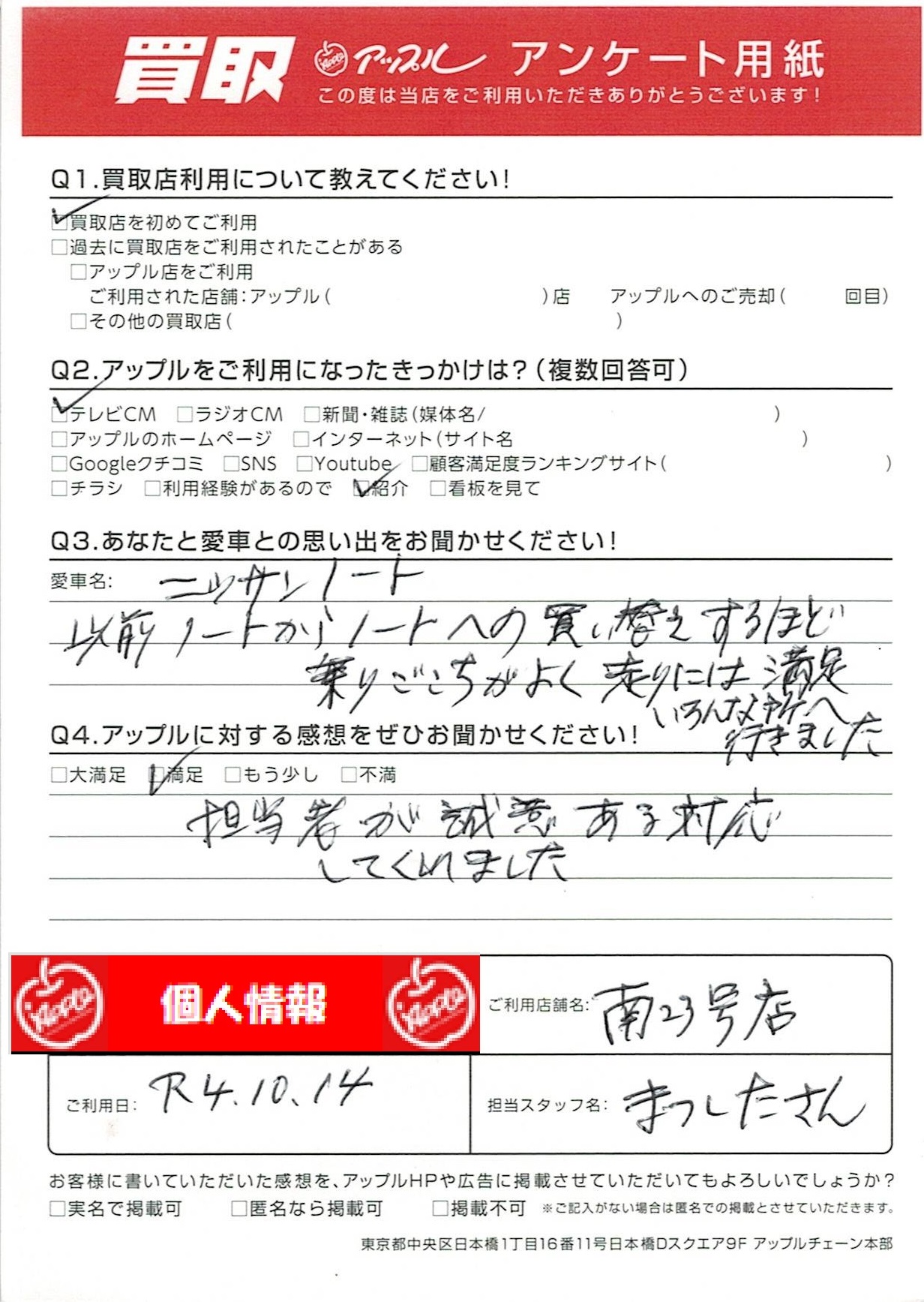 お車のご相談・ 査定だけでもOK! カンタン 入力 30秒 アップルがブランド買取始めました! お電話でも受付中! 受付時間10:00~19:00 052-619-3373 お車のご相談・ 査定だけでもOK! カンタン 入力 30秒 アップルがブランド買取始めました! お電話でも受付中! 受付時間10:00~19:00 052-619-3373 アップルがブランド買取始めました! お電話でも受付中! 受付時間10:00~19:00 052-619-3373 店舗情報 在庫車 スタッフ紹介 ブログ お客様の声 キャンペーン 無料査定 click お客様の声 ご記入日: 2022/10/14 M様 車名:日産 ノート 担当者が誠意ある対応してくれました 前へ 次へ お客様の声一覧を見る