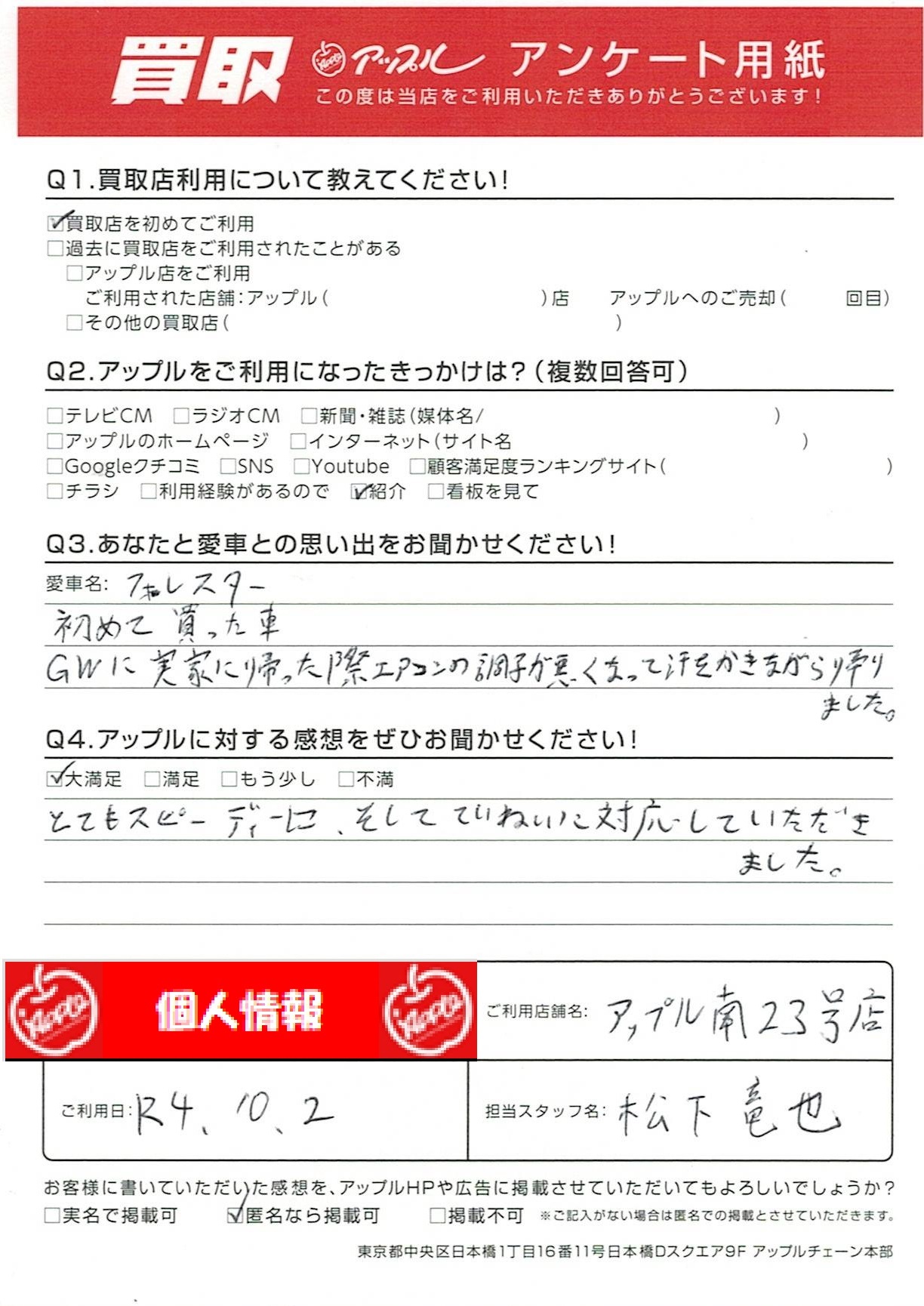 お車のご相談・ 査定だけでもOK! カンタン 入力 30秒 アップルがブランド買取始めました! お電話でも受付中! 受付時間10:00~19:00 052-619-3373 お車のご相談・ 査定だけでもOK! カンタン 入力 30秒 アップルがブランド買取始めました! お電話でも受付中! 受付時間10:00~19:00 052-619-3373 アップルがブランド買取始めました! お電話でも受付中! 受付時間10:00~19:00 052-619-3373 店舗情報 在庫車 スタッフ紹介 ブログ お客様の声 キャンペーン 無料査定 click お客様の声 ご記入日: 2022/10/02 H様 車名:スバル フォレスター とてもスピーディーに、そしてていねいに対応していただきました。 前へ 次へ お客様の声一覧を見る