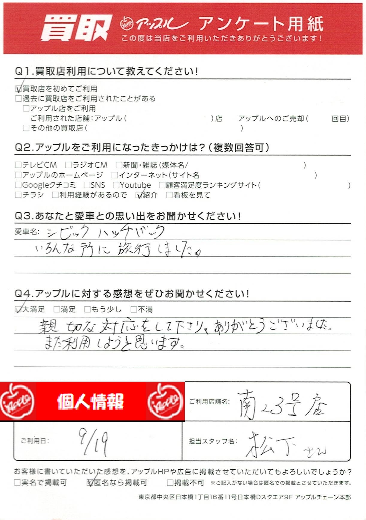 お車のご相談・ 査定だけでもOK! カンタン 入力 30秒 アップルがブランド買取始めました! お電話でも受付中! 受付時間10:00~19:00 052-619-3373 お車のご相談・ 査定だけでもOK! カンタン 入力 30秒 アップルがブランド買取始めました! お電話でも受付中! 受付時間10:00~19:00 052-619-3373 アップルがブランド買取始めました! お電話でも受付中! 受付時間10:00~19:00 052-619-3373 店舗情報 在庫車 スタッフ紹介 ブログ お客様の声 キャンペーン 無料査定 click お客様の声 ご記入日: 2022/09/19 N様 車名:ホンダ シビックハッチバック 親切な対応をして下さり、ありがとうございました。また利用したいと思います。 前へ 次へ お客様の声一覧を見る