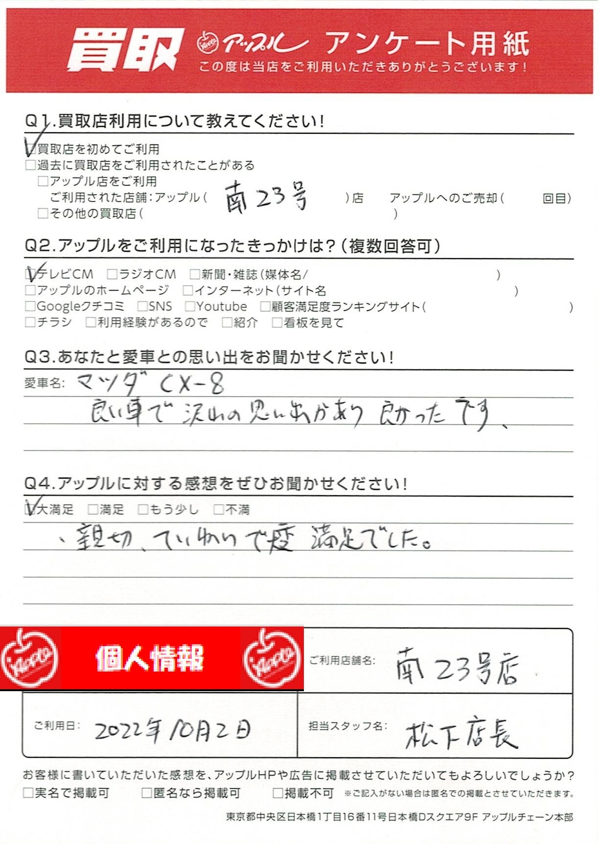 お車のご相談・ 査定だけでもOK! カンタン 入力 30秒 アップルがブランド買取始めました! お電話でも受付中! 受付時間10:00~19:00 052-619-3373 お車のご相談・ 査定だけでもOK! カンタン 入力 30秒 アップルがブランド買取始めました! お電話でも受付中! 受付時間10:00~19:00 052-619-3373 アップルがブランド買取始めました! お電話でも受付中! 受付時間10:00~19:00 052-619-3373 店舗情報 在庫車 スタッフ紹介 ブログ お客様の声 キャンペーン 無料査定 click お客様の声 ご記入日: 2022/10/02 K様 車名:マツダ CX-8 親切、ていねいで大変満足でした。 前へ 次へ お客様の声一覧を見る
