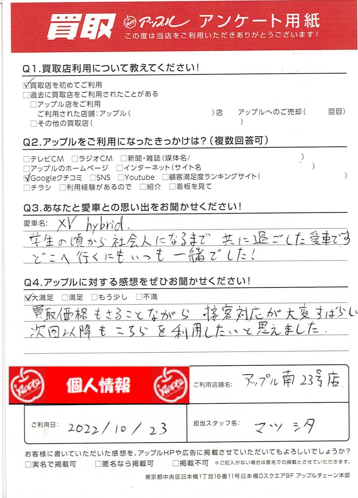 お車のご相談・ 査定だけでもOK! カンタン 入力 30秒 アップルがブランド買取始めました! お電話でも受付中! 受付時間10:00~19:00 052-619-3373 お車のご相談・ 査定だけでもOK! カンタン 入力 30秒 アップルがブランド買取始めました! お電話でも受付中! 受付時間10:00~19:00 052-619-3373 アップルがブランド買取始めました! お電話でも受付中! 受付時間10:00~19:00 052-619-3373 店舗情報 在庫車 スタッフ紹介 ブログ お客様の声 キャンペーン 無料査定 click お客様の声 ご記入日: 2022/10/23 K様 車名:スバル インプレッサXV (~2017年5月) 買取価格もさることながら 接客対応が大変すばらしい。次回以降もこちらを利用したいと思えました。 前へ 次へ お客様の声一覧を見る