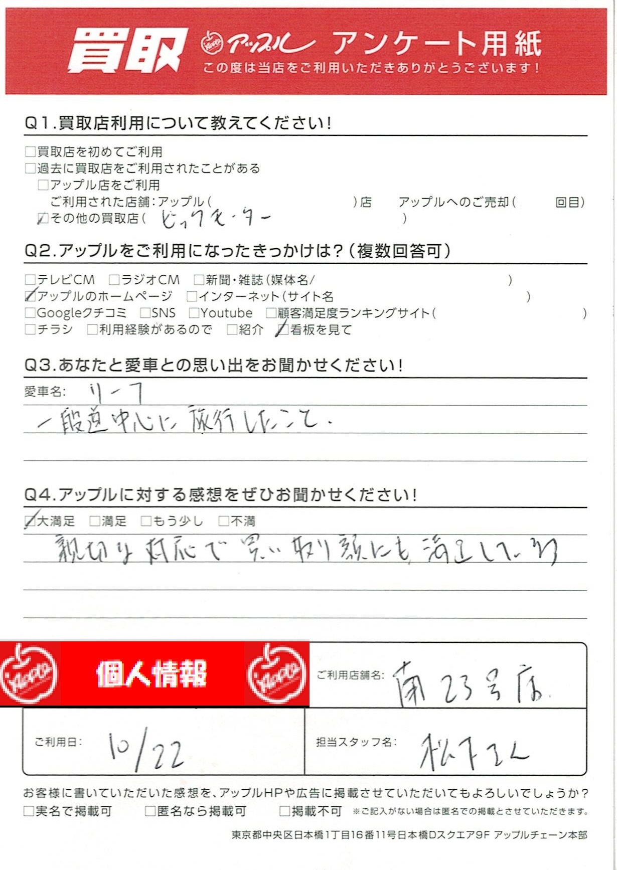 お車のご相談・ 査定だけでもOK! カンタン 入力 30秒 アップルがブランド買取始めました! お電話でも受付中! 受付時間10:00~19:00 052-619-3373 お車のご相談・ 査定だけでもOK! カンタン 入力 30秒 アップルがブランド買取始めました! お電話でも受付中! 受付時間10:00~19:00 052-619-3373 アップルがブランド買取始めました! お電話でも受付中! 受付時間10:00~19:00 052-619-3373 店舗情報 在庫車 スタッフ紹介 ブログ お客様の声 キャンペーン 無料査定 click お客様の声 ご記入日: 2022/10/22 T様 車名:日産 リーフ 親切な対応で買い取り額にも満足しています 前へ 次へ お客様の声一覧を見る