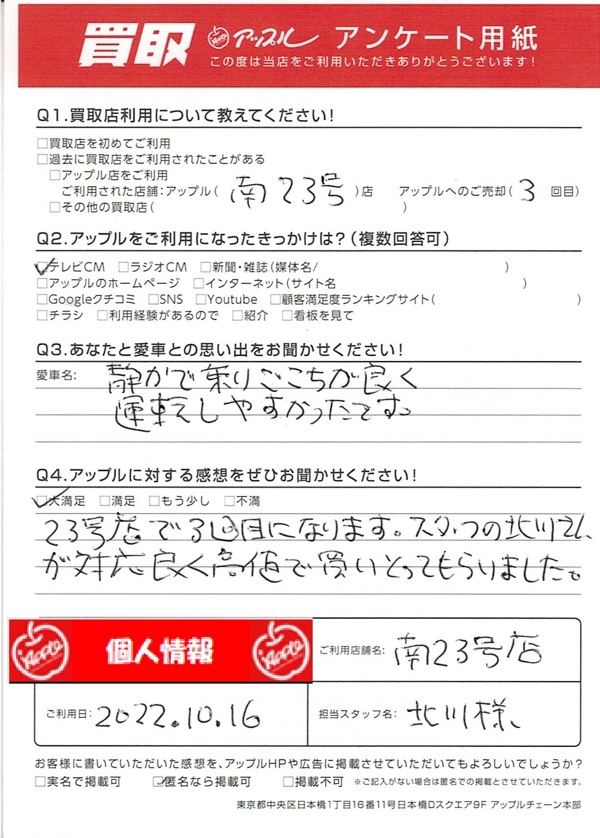 お車のご相談・ 査定だけでもOK! カンタン 入力 30秒 アップルがブランド買取始めました! お電話でも受付中! 受付時間10:00~19:00 052-619-3373 お車のご相談・ 査定だけでもOK! カンタン 入力 30秒 アップルがブランド買取始めました! お電話でも受付中! 受付時間10:00~19:00 052-619-3373 アップルがブランド買取始めました! お電話でも受付中! 受付時間10:00~19:00 052-619-3373 店舗情報 在庫車 スタッフ紹介 ブログ お客様の声 キャンペーン 無料査定 click お客様の声 ご記入日: 2022/10/16 I様 23号店で3回目になります。スタッフの北川さんが対応良く高値で買いとってもらいました。 前へ 次へ お客様の声一覧を見る