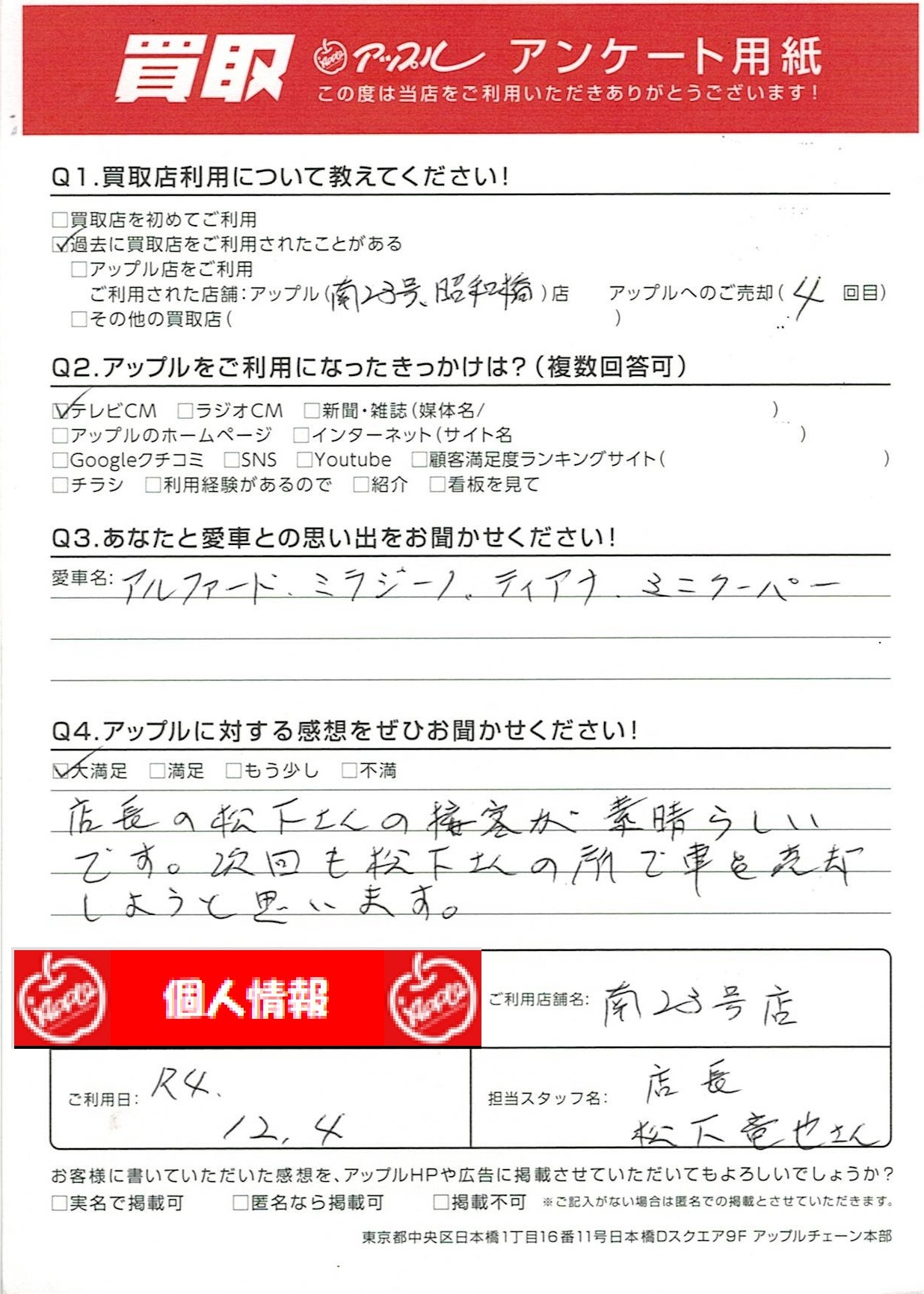 お車のご相談・ 査定だけでもOK! カンタン 入力 30秒 アップルがブランド買取始めました! お電話でも受付中! 受付時間10:00~19:00 052-619-3373 お車のご相談・ 査定だけでもOK! カンタン 入力 30秒 アップルがブランド買取始めました! お電話でも受付中! 受付時間10:00~19:00 052-619-3373 アップルがブランド買取始めました! お電話でも受付中! 受付時間10:00~19:00 052-619-3373 店舗情報 在庫車 スタッフ紹介 ブログ お客様の声 キャンペーン 無料査定 click お客様の声 ご記入日: 2022/12/04 I様 店長の松下さんの接客が素晴らしいです。次回も松下さんの所で車を売却しようと思います。 前へ 次へ お客様の声一覧を見る