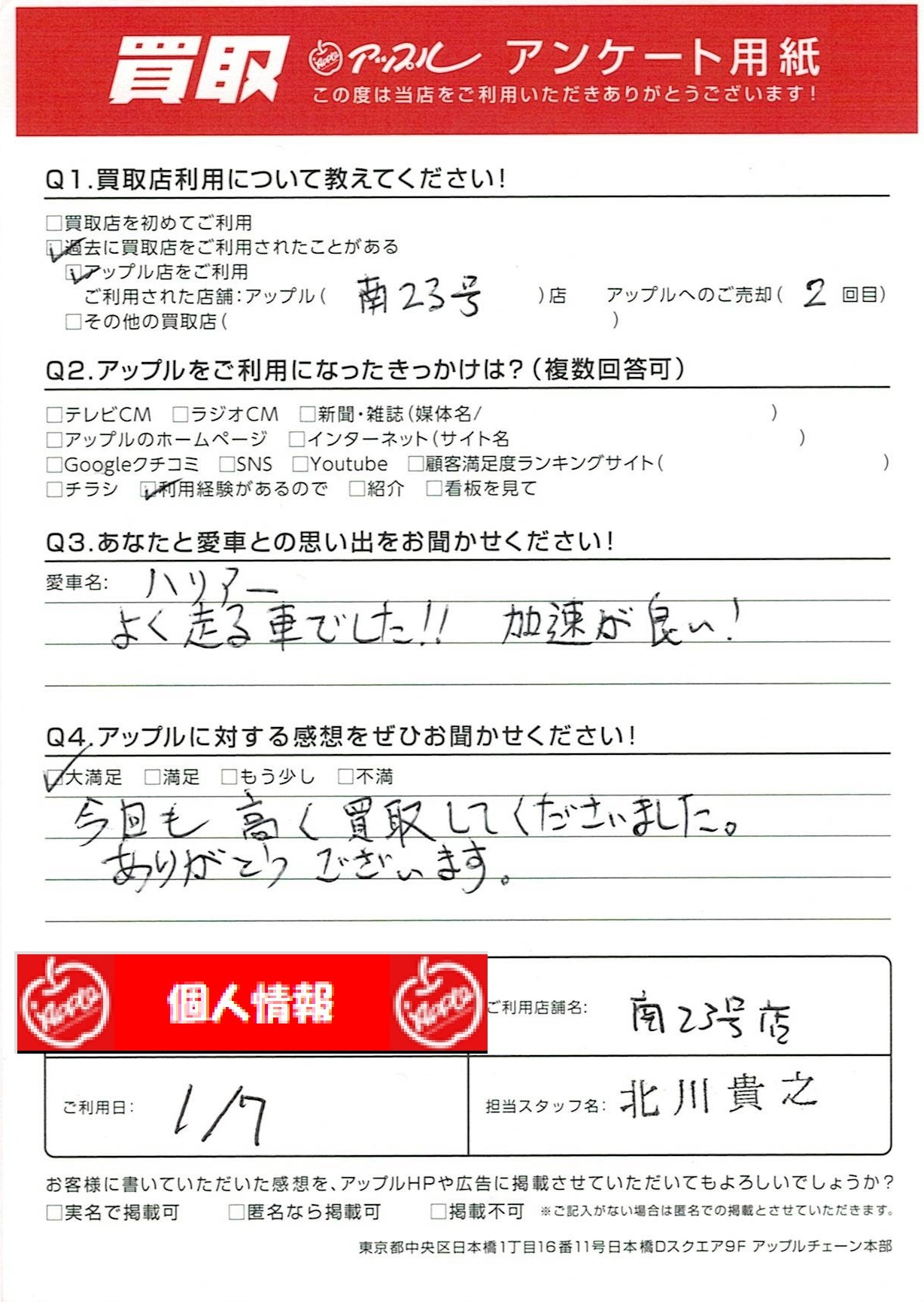 お車のご相談・ 査定だけでもOK! カンタン 入力 30秒 アップルがブランド買取始めました! お電話でも受付中! 受付時間10:00~19:00 052-619-3373 お車のご相談・ 査定だけでもOK! カンタン 入力 30秒 アップルがブランド買取始めました! お電話でも受付中! 受付時間10:00~19:00 052-619-3373 アップルがブランド買取始めました! お電話でも受付中! 受付時間10:00~19:00 052-619-3373 店舗情報 在庫車 スタッフ紹介 ブログ お客様の声 キャンペーン 無料査定 click お客様の声 ご記入日: 2023/01/07 B様 車名:トヨタ ハリアー (H25年12月~のハイブリッド含む) 今回も高く買取してくださいました。ありがとうございます。 前へ 次へ お客様の声一覧を見る