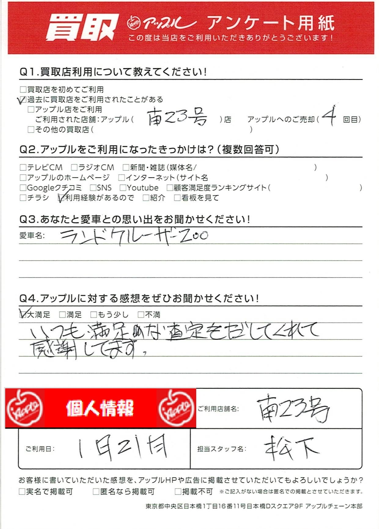 お車のご相談・ 査定だけでもOK! カンタン 入力 30秒 アップルがブランド買取始めました! お電話でも受付中! 受付時間10:00~19:00 052-619-3373 お車のご相談・ 査定だけでもOK! カンタン 入力 30秒 アップルがブランド買取始めました! お電話でも受付中! 受付時間10:00~19:00 052-619-3373 アップルがブランド買取始めました! お電話でも受付中! 受付時間10:00~19:00 052-619-3373 店舗情報 在庫車 スタッフ紹介 ブログ お客様の声 キャンペーン 無料査定 click お客様の声 ご記入日: 2023/01/21 F様 車名:トヨタ ランドクルーザー200(H19年9月~) いつも満足な査定をだしてくれて感謝してます。 前へ 次へ お客様の声一覧を見る