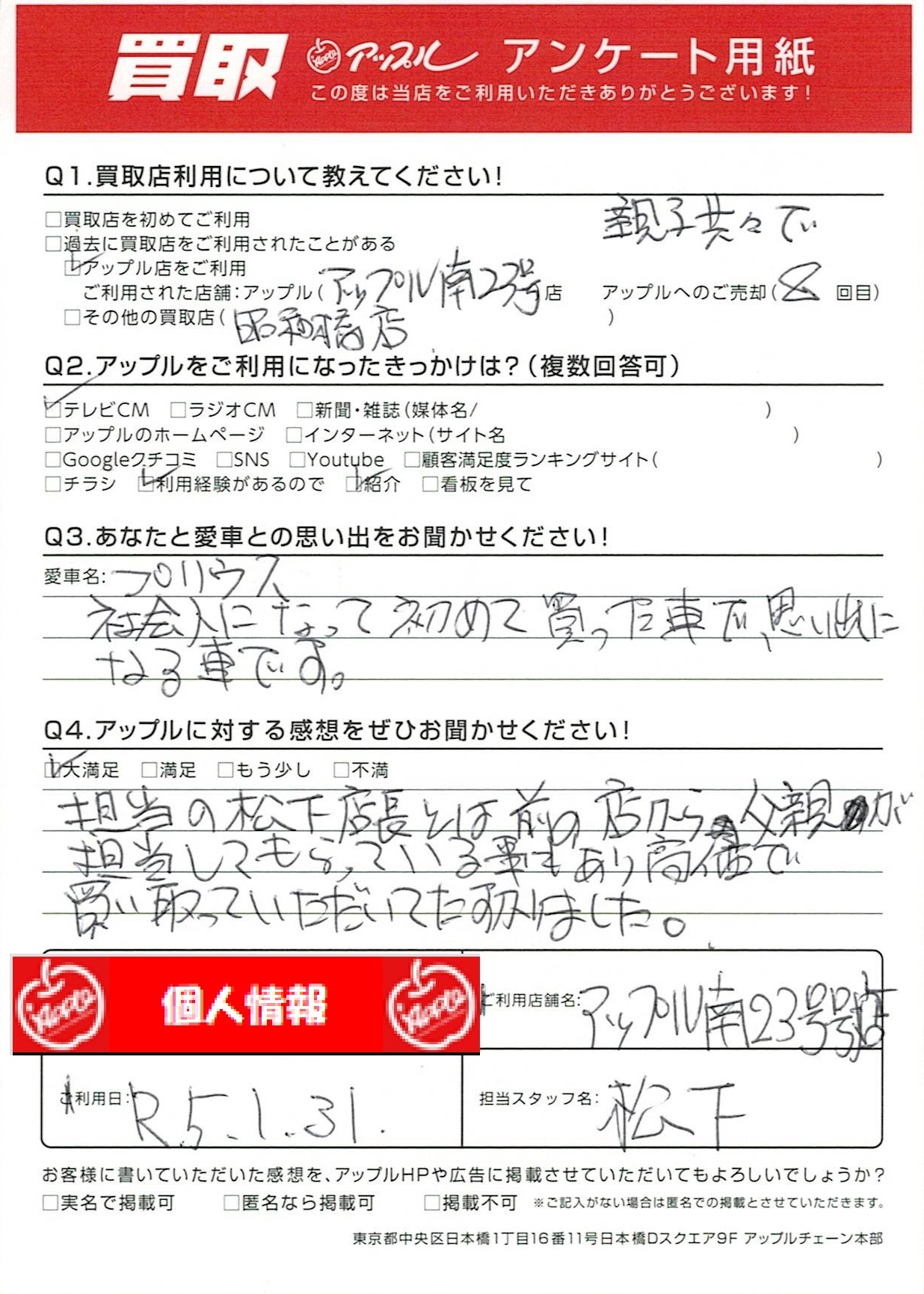 お車のご相談・ 査定だけでもOK! カンタン 入力 30秒 アップルがブランド買取始めました! お電話でも受付中! 受付時間10:00~19:00 052-619-3373 お車のご相談・ 査定だけでもOK! カンタン 入力 30秒 アップルがブランド買取始めました! お電話でも受付中! 受付時間10:00~19:00 052-619-3373 アップルがブランド買取始めました! お電話でも受付中! 受付時間10:00~19:00 052-619-3373 店舗情報 在庫車 スタッフ紹介 ブログ お客様の声 キャンペーン 無料査定 click お客様の声 ご記入日: 2023/01/31 H様 車名:トヨタ プリウス(2023年3月~のPHVを含む) 担当の松下店長とは前の店から父親が担当してもらっている事もあり高価で買い取っていただいてたすかりました。 前へ 次へ お客様の声一覧を見る