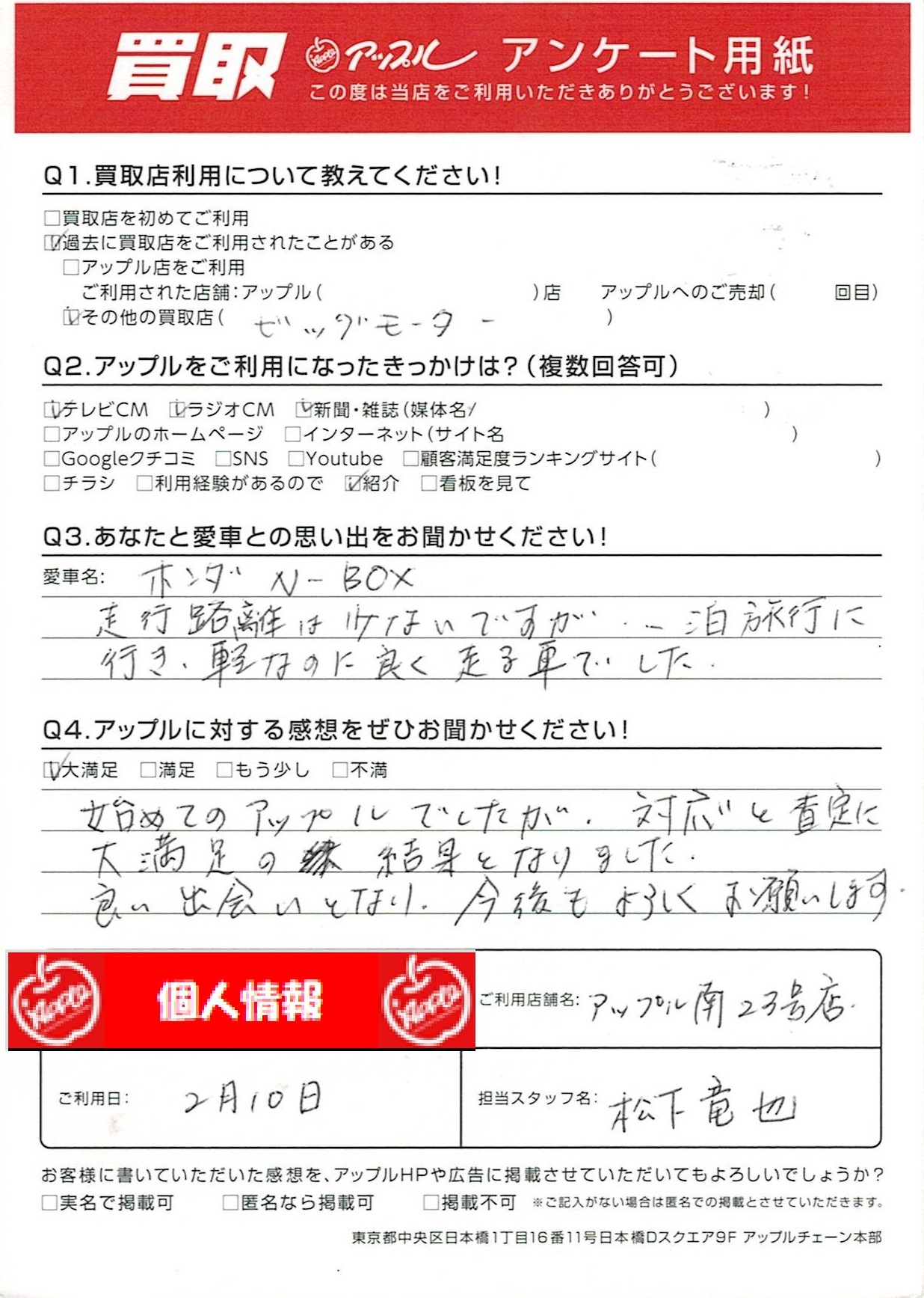 お車のご相談・ 査定だけでもOK! カンタン 入力 30秒 アップルがブランド買取始めました! お電話でも受付中! 受付時間10:00~19:00 052-619-3373 お車のご相談・ 査定だけでもOK! カンタン 入力 30秒 アップルがブランド買取始めました! お電話でも受付中! 受付時間10:00~19:00 052-619-3373 アップルがブランド買取始めました! お電話でも受付中! 受付時間10:00~19:00 052-619-3373 店舗情報 在庫車 スタッフ紹介 ブログ お客様の声 キャンペーン 無料査定 click お客様の声 ご記入日: 2023/02/10 H様 車名:ホンダ N-BOX 初めてのアップルでしたが、対応と査定に大満足の結果となりました。良い出会いとなり、今後もよろしくお願いします。 前へ 次へ お客様の声一覧を見る